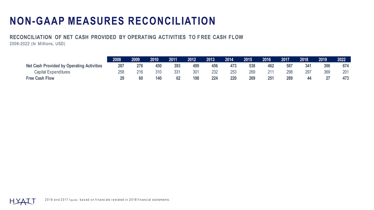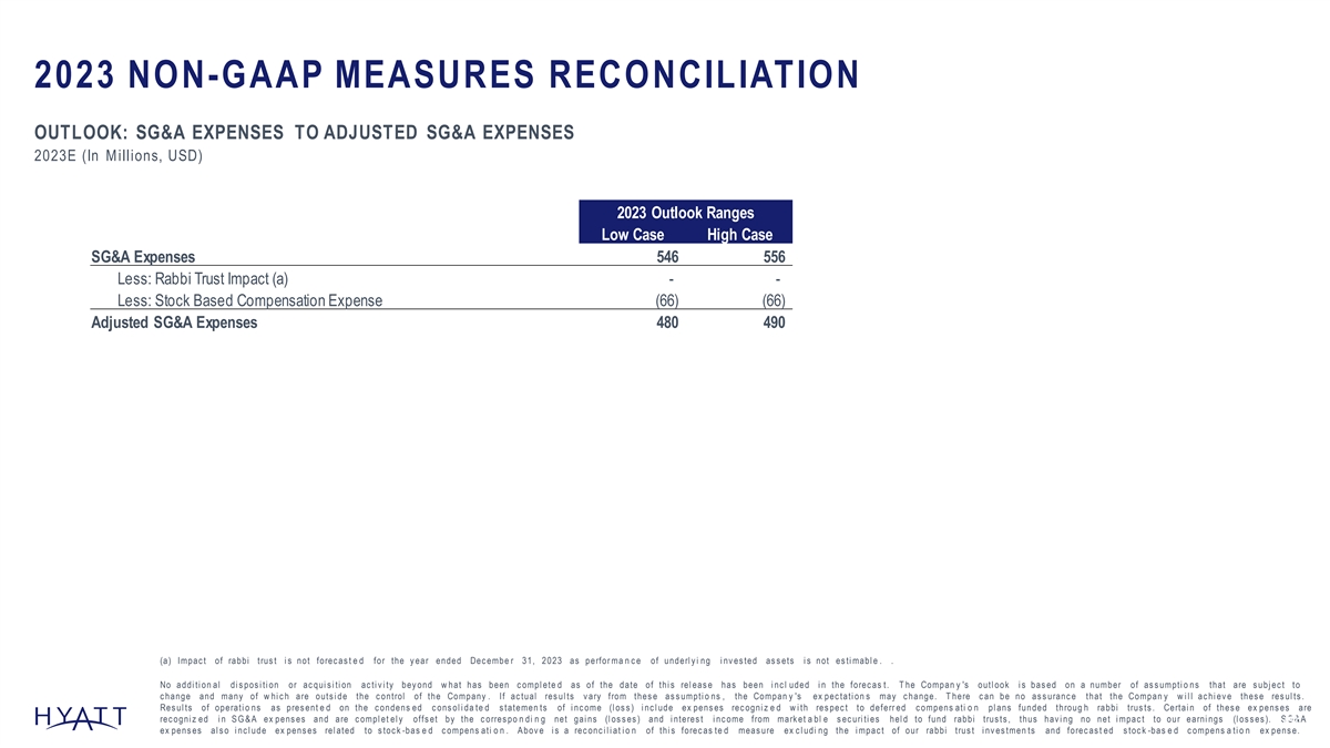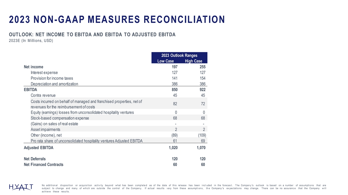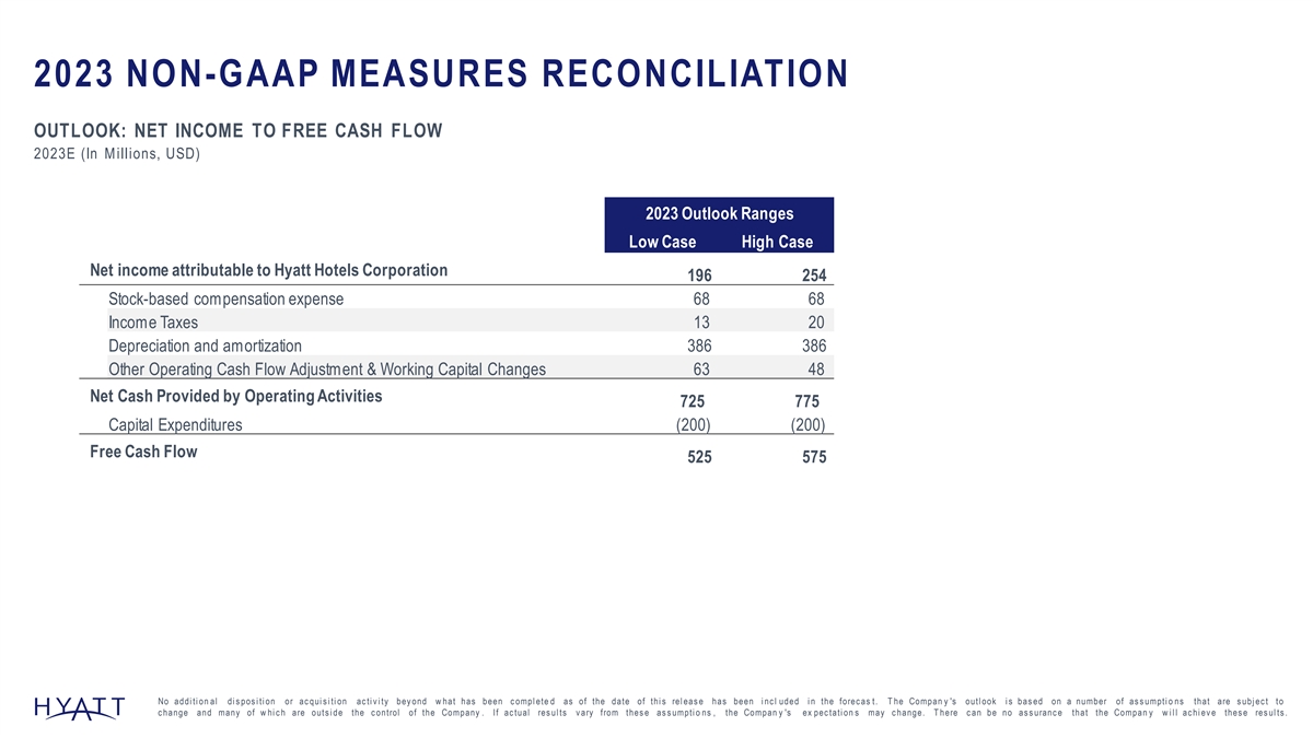 2023 NON-GAAP MEASURES RECONCILIATION OUTLOOK: NET INCOME TO FREE CASH FLOW 2023E (In Millions, USD) 2023 Outlook Ranges Low Case High Case Net income attributable to Hyatt Hotels Corporation 196 254 Stock-based compensation expense 68 68 Income Taxes 13 20 Depreciation and amortization 386 386 Other Operating Cash Flow Adjustment & Working Capital Changes 63 48 Net Cash Provided by Operating Activities 725 775 Capital Expenditures (200) (200) Free Cash Flow 525 575 No addi ti on al di s pos i ti on or ac qui s i ti on ac ti v i ty bey ond w hat has been c ompl ete d as of the date of thi s rel eas e has been i nc l uded i n the forec as t. T he Compan y 's outl ook i s bas ed on a number of as s umpti o ns that are s ubj ec t to c hange and many of w hi c h are outs i de the c ontrol of the Company . If ac tual res ul ts v ary from thes e as s umpti o ns , the Compan y 's ex pec tati on s may c hange. T here c an be no as s uranc e that the Compan y w i l l ac hi ev e thes e res ul ts . 148