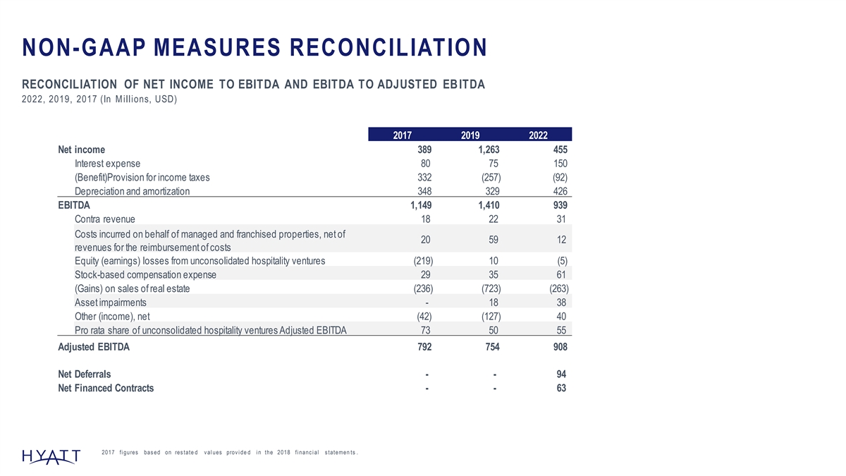NON-GAAP MEASURES RECONCILIATION RECONCILIATION OF NET INCOME TO EBITDA AND EBITDA TO ADJUSTED EB ITDA 2022, 2019, 2017 (In M illions, USD) 2017 2019 2022 Net income 389 1,263 455 Interest expense 80 75 150 (Benefit)Provision for income taxes 332 (257) (92) Depreciation and amortization 348 329 426 EBITDA 1,149 1,410 939 Contra revenue 18 22 31 Costs incurred on behalf of managed and franchised properties, net of 20 59 12 revenues for the reimbursement of costs Equity (earnings) losses from unconsolidated hospitality ventures (219) 10 (5) Stock-based compensation expense 29 35 61 (Gains) on sales of real estate (236) (723) (263) Asset impairments - 18 38 Other (income), net (42) (127) 40 Pro rata share of unconsolidated hospitality ventures Adjusted EBITDA 73 50 55 Adjusted EBITDA 792 754 908 Net Deferrals - - 94 Net Financed Contracts - - 63 2017 fi gures bas ed on res tate d v al ues prov i de d i n the 2018 fi nanc i al s tatemen ts . 146