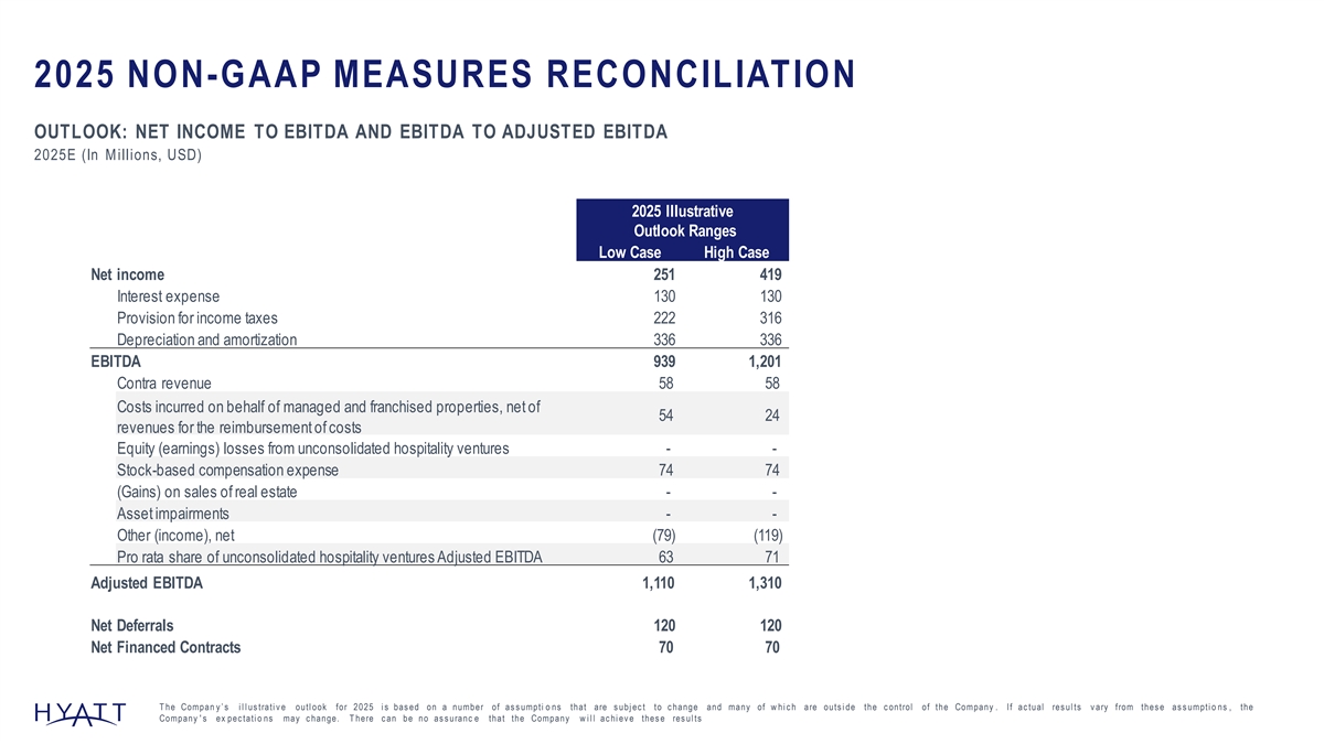 2025 NON-GAAP MEASURES RECONCILIATION OUTLOOK: NET INCOME TO EBITDA AND EBITDA TO ADJUSTED EBITDA 2025E (In Millions, USD) 2025 Illustrative Outlook Ranges Low Case High Case Net income 251 419 Interest expense 130 130 Provision for income taxes 222 316 Depreciation and amortization 336 336 EBITDA 939 1,201 Contra revenue 58 58 Costs incurred on behalf of managed and franchised properties, net of 54 24 revenues for the reimbursement of costs Equity (earnings) losses from unconsolidated hospitality ventures - - Stock-based compensation expense 74 74 (Gains) on sales of real estate - - Asset impairments - - Other (income), net (79) (119) Pro rata share of unconsolidated hospitality ventures Adjusted EBITDA 63 71 Adjusted EBITDA 1,110 1,310 Net Deferrals 120 120 Net Financed Contracts 70 70 T he Compan y ’ s i l l us trati v e outl ook for 2025 i s bas ed on a number of as s umpti o ns that are s ubj ec t to c hange and many of w hi c h are outs i de the c ontrol of the Company . If ac tual res ul ts v ary from thes e as s umpti o ns , the Company ' s ex pec tati o ns may c hange. T here c an be no as s uranc e that the Company w i l l ac hi ev e thes e res ul ts 150