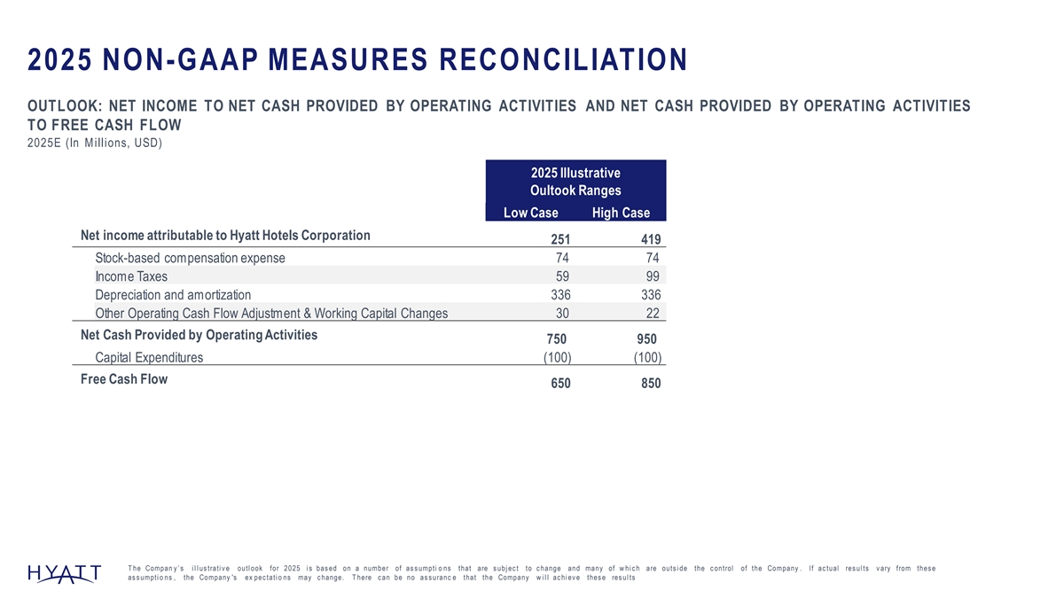 2025 NON-GAAP MEASURES RECONCILIATION OUTLOOK: NET INCOME TO NET CASH PROVIDED BY OPERATING ACTIVITIES AND NET CASH PROVIDED BY OPERATING ACTIVITIES TO FREE CASH FLOW 2025E (In Millions, USD) 2025 Illustrative Oultook Ranges Low Case High Case Net income attributable to Hyatt Hotels Corporation 251 419 Stock-based compensation expense 74 74 Income Taxes 59 99 Depreciation and amortization 336 336 Other Operating Cash Flow Adjustment & Working Capital Changes 30 22 Net Cash Provided by Operating Activities 750 950 Capital Expenditures (100) (100) Free Cash Flow 650 850 T he Compan y ’ s i l l us trati v e outl ook for 2025 i s bas ed on a number of as s umpti o ns that are s ubj ec t to c hange and many of w hi c h are outs i de the c ontrol of the Company . If ac tual res ul ts v ary from thes e as s umpti o ns , the Company 's ex pec tati o ns may c hange. T here c an be no as s uranc e that the Company w i l l ac hi ev e thes e res ul ts 151