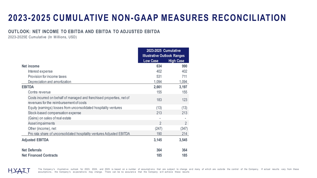 2023-2025 CUMULATIVE NON-GAAP MEASURES RECONCILIATION OUTLOOK: NET INCOME TO EBITDA AND EBITDA TO ADJUSTED EBITDA 2023-2025E Cumulative (In M illions, USD) 2023-2025 Cumulative Illustrative Outlook Ranges Low Case High Case Net income 634 990 Interest expense 402 402 Provision for income taxes 531 711 Depreciation and amortization 1,094 1,094 EBITDA 2,661 3,197 Contra revenue 155 155 Costs incurred on behalf of managed and franchised properties, net of 183 123 revenues for the reimbursement of costs Equity (earnings) losses from unconsolidated hospitality ventures (13) (13) Stock-based compensation expense 213 213 (Gains) on sales of real estate - - Asset impairments 2 2 Other (income), net (247) (347) Pro rata share of unconsolidated hospitality ventures Adjusted EBITDA 190 214 Adjusted EBITDA 3,145 3,545 Net Deferrals 364 364 Net Financed Contracts 185 185 T he Compan y 's i l l us trati v e outl ook for 2023, 2024, and 2025 i s bas ed on a number of as s umpti on s that are s ubj ec t to c hange an d many of w hi c h are outs i de the c ontrol of the Compan y . If ac tual res ul ts v ary from thes e as s umpti o ns , the Company 's ex pec tati o ns may c hange. T here c an be no as s uranc e that the Company w i l l ac hi ev e thes e res ul ts 152