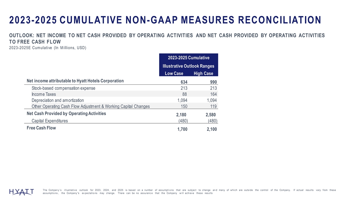 2023-2025 CUMULATIVE NON-GAAP MEASURES RECONCILIATION OUTLOOK: NET INCOME TO NET CASH PROVIDED BY OPERATING ACTIVITIES AND NET CASH PROVIDED BY OPERATING ACTIVITIES TO FREE CASH FLOW 2023-2025E Cumulative (In M illions, USD) 2023-2025 Cumulative Illustrative Outlook Ranges Low Case High Case Net income attributable to Hyatt Hotels Corporation 634 990 Stock-based compensation expense 213 213 Income Taxes 88 164 Depreciation and amortization 1,094 1,094 Other Operating Cash Flow Adjustment & Working Capital Changes 150 119 Net Cash Provided by Operating Activities 2,180 2,580 Capital Expenditures (480) (480) Free Cash Flow 1,700 2,100 T he Compan y ’ s i l l us trati v e outl ook for 2023, 2024, and 2025 i s bas ed on a number of as s umpti o ns that are s ubj ec t to c hange an d many of w hi c h are outs i de the c ontrol of the Company . If ac tual res ul ts v ary from thes e as s umpti o ns , the Company 's ex pec tati o ns may c hange. T here c an be no as s uranc e that the Company w i l l ac hi ev e thes e res ul ts 153
