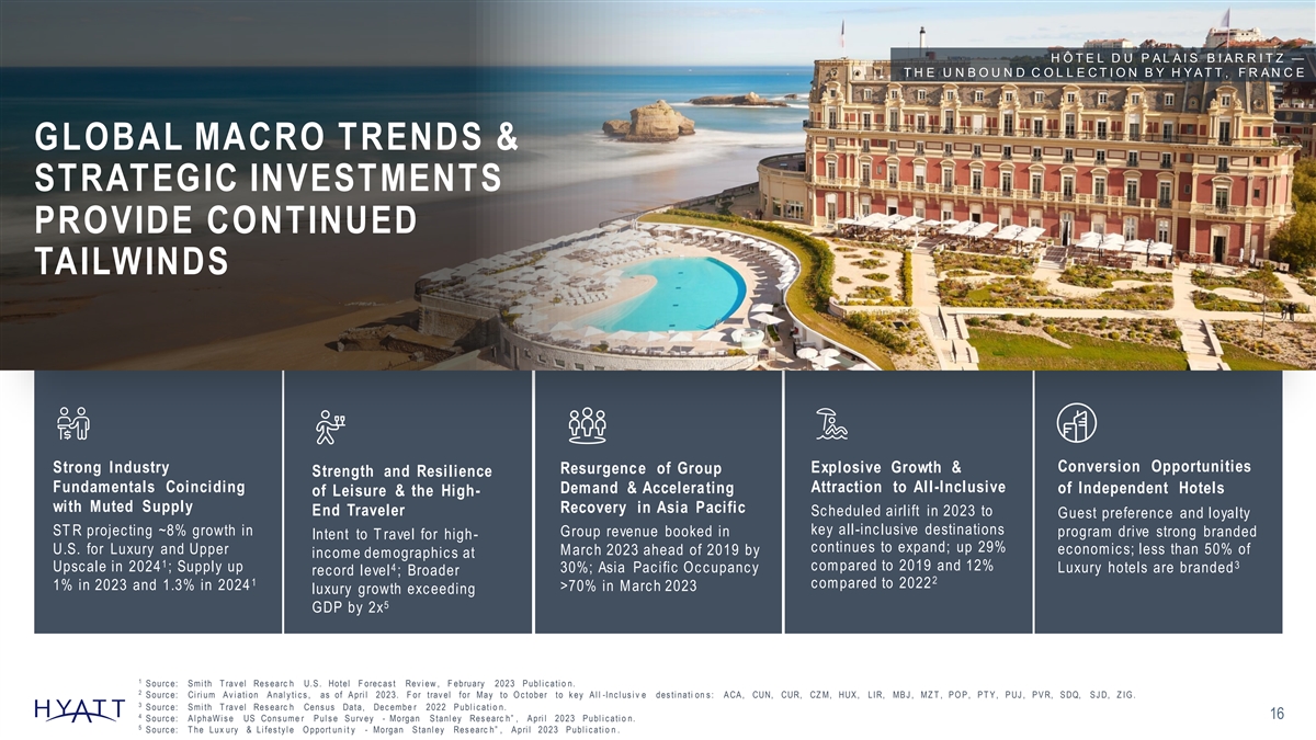 … AND WE’RE OUTPACING THE INDUSTRY SYSTEM-WIDE ROOMS VS 2017 FEE REVENUE VS 2017 PIPELINE VS 2017 LOYALTY MEMBERS VS 2017 + % + % + % + % 64 62 67 260 +37% +31% +114% +22% +23% +21% +14% +61% +15% +8% +5% +15% S ourc e: P ubl i c fi l i ngs for Hy att Hotel s Corpor a ti o n , Hi l ton Worl dw i de Hol di ngs Inc ., Marri ot t Interna ti on al Inc ., and IHG Hot el s & Res orts . Cal c ul ate d c ompari s o n s bas ed on y ear ends 2017 and 2022; 2017 fee rev enu e fi gures bas ed on fi nanc i al s res tate d i n 2018 fi nanc i al s tateme nt s . 15