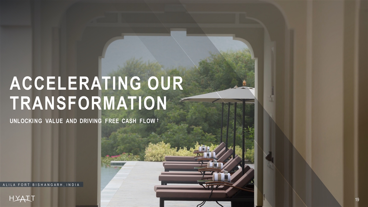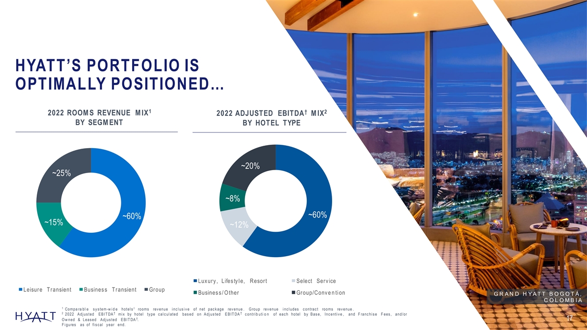 HYATT’S PORTFOLIO IS OPTIMALLY POSITIONED… 1 † 2 2022 ROOM S REVENUE M IX 2022 ADJUSTED EBITDA M IX BY SEGM ENT BY HOTEL TYPE ~20% ~25% ~8% ~60% ~60% ~15% ~12% Lux ury , Lifes ty l e, Resort Select Serv ice Leisure Transient Busines s Transient Group Busines s / O ther Group/Conv e n ti on G R A N D H Y A T T B O G O T Á , C O L O M B I A 1à Compa ra bl e s y s tem -w i d e hotel s rooms rev enue i nc l us i v e of net pac k age rev enue . G roup rev enue i nc l udes c ontrac t rooms rev enue . 2 † † 2022 A dj us ted E B IT DA mi x by hotel ty pe c al c ul ated bas ed on A dj us ted E B IT DA c ontri b uti o n of eac h hotel by B as e, Inc enti v e , and F ranc hi s e F ees , and/or † 17 O w ned & Leas ed A dj us ted E B IT DA . F i gures as of fi s c al y ear end.