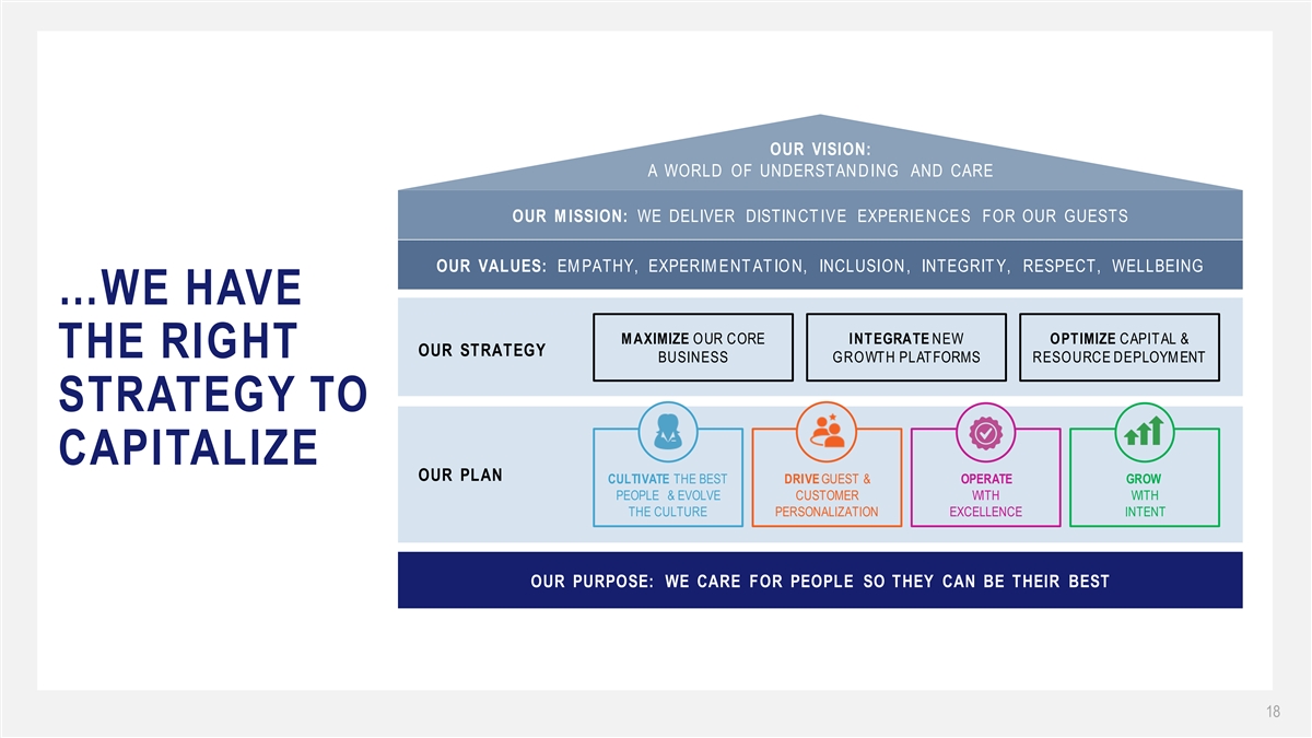 OUR VISION: A WORLD OF UNDERSTAN D ING AND CARE OUR M ISSION: WE DELIVER DISTINCT IVE EXPERIENCES FOR OUR GUESTS OUR VALUES: EM PATHY, EXPERIM ENT AT IO N, INCLUSION, INTEGRIT Y, RESPECT, WELLBEING …WE HAVE M AXIMIZE OUR CORE INTEGRATE NEW OPTIMIZE CAPITAL & OUR STRATEGY THE RIGHT BUSINESS GROWTH PLATFORMS RESOURCE DEPLOYMENT STRATEGY TO CAPITALIZE OUR PLAN CULTIVATE THE BEST DRIVE GUEST & OPERATE GROW PEOPLE & EVOLVE CUSTOMER WITH WITH THE CULTURE PERSONALIZATION EXCELLENCE INTENT OUR PURPOSE: WE CARE FOR PEOPLE SO THEY CAN BE THEIR BEST 18