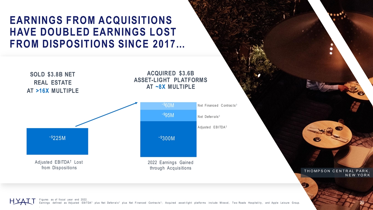 EARNINGS FROM ACQUISITIONS HAVE DOUBLED EARNINGS LOST FROM DISPOSITIONS SINCE 2017… ACQUIRED $3.6B SOLD $3.8B NET ASSET-LIGHT PLATFORMS REAL ESTATE AT ~8X MULTIPLE AT >16X MULTIPLE ~$à N et Finance d C ontrac ts 60M ~$ à 95M N et Deferr a ls † A djuste d E B ITDA ~$ ~$ ~$ 225M 300M 225M † Adjusted EBITDA Lost 2022 Earnings Gained from Dispositions through Acquisitions T H O M P S O N C E N T R A L P A R K , N E W Y O R K F i gures as of fi s c al y ear end 2022. †àà E arni ngs defi ned as A dj us ted E B IT DA pl us Net Deferr al s pl us Net F i nanc ed Contrac ts ; A c qui red as s et -l i gh t pl atfor ms i nc l ude Mi rav al , T w o Roads Hos pi tal i ty , and A ppl e Lei s ure G roup. 20 .