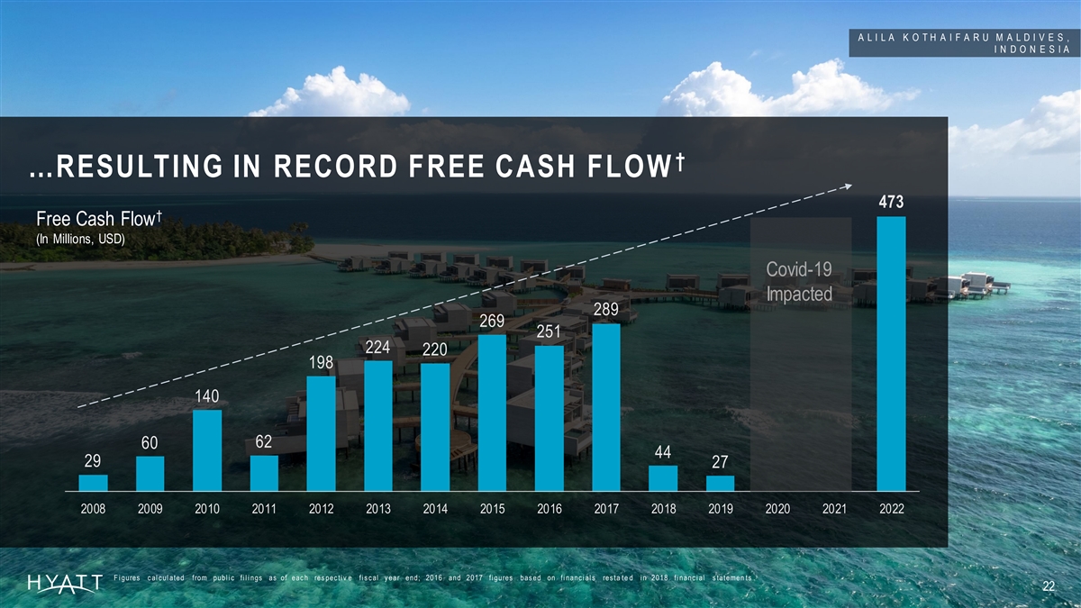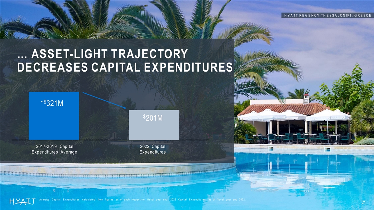 H Y A T T R E G E N C Y T H E S S A L O N I K I , G R E E C E … ASSET-LIGHT TRAJECTORY DECREASES CAPITAL EXPENDITURES ~$ 321M $ 201M 2017-2019 Capital 2022 Capital Expenditures Average Expenditures A v erage Capi tal E x pendi tur es c al c ul ate d from fi gures as of eac h res pec ti v e fi s c al y ear end. 2022 Capi tal E x pendi tu r es as of f i s c al y ear end 2022. . 21