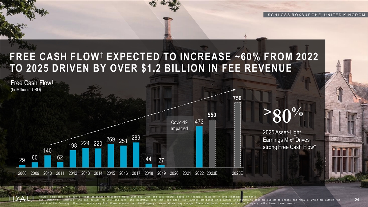 S C H L O S S R O X B U R G H E , U N I T E D K I N G D O M † FREE CASH FLOW EXPECTED TO INCREASE ~60% FROM 2022 TO 2025 DRIVEN BY OVER $1.2 BILLION IN FEE REVENUE † Free Cash Flow (In Millions, USD) 750 > % 550 80 473 Covid-19 Impacted 2025 Asset-Light 289 à 269 Earnings Mix Drives 251 224 220 † 198 strong Free Cash Flow 140 60 62 44 29 27 2008 2009 2010 2011 2012 2013 2014 2015 2016 2017 2018 2019 2020 2021 2022 2023E 2025E F i gures c al c ul ated from publ i c fi l i ngs as of eac h res pec ti v e fi s c al y ear end; 2016 and 2017 fi gures bas ed on fi nanc i al s res ta te d i n 2018 fi nanc i al s tatemen ts . † T he Compan y ’ s i l l us trati v e l ong -te r m outl ook for 2024 and 2025, and i l l us trati v e l ong -te r m F ree Cas h F l ow outl ook are bas ed on a number of as s umpti on s that are s ubj ec t to c hange and many of w hi c h are outs i de the 24 c ontrol of the Company . If ac tual res ul ts v ary from thes e as s umpti o ns , the Compan y 's ex pec tati on s may c hange. T here c an be no as s uranc e that the Compan y w i l l ac hi ev e thes e res ul ts .