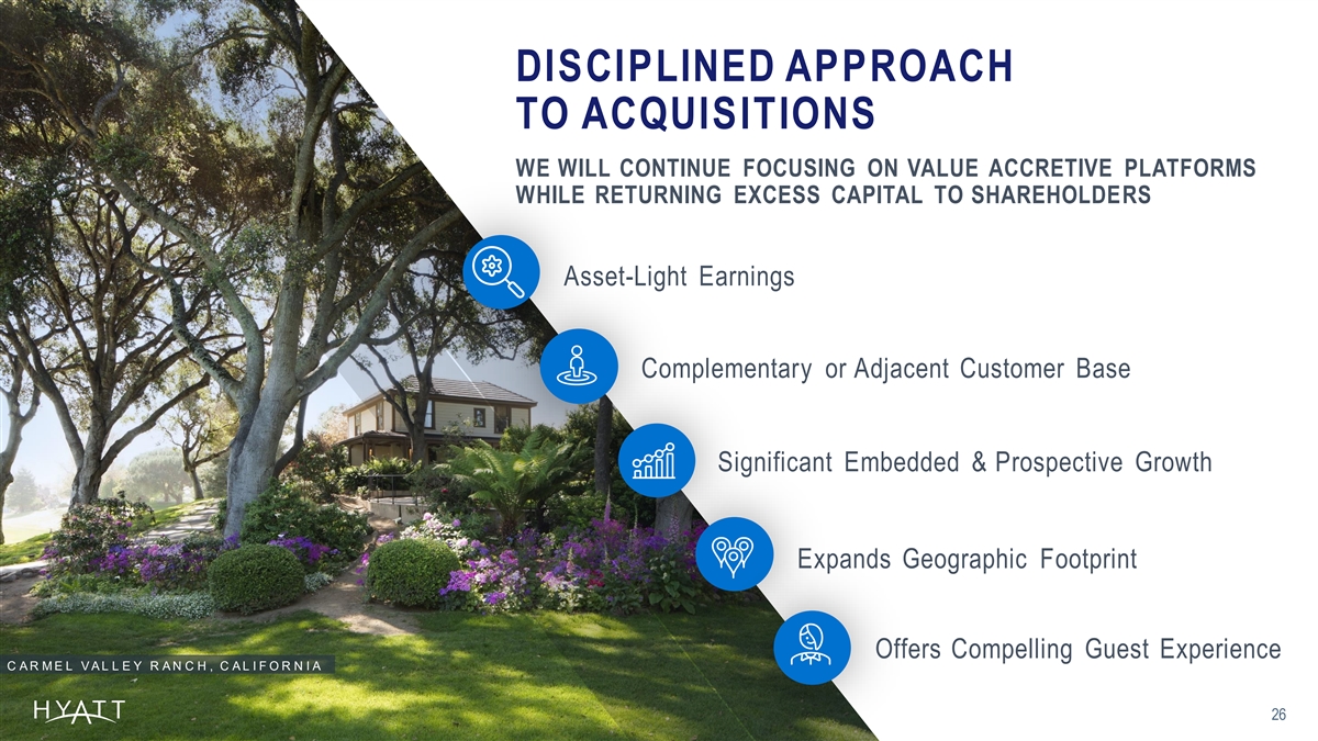 CAPACITY TO EXPAND SELL -DOWN COMMITMENT BEYOND 2024: ESTIMATED $2.6B-$3.2B IN OWNED ASSET VALUE REMAINING AFTER COMPLETION OF CURRENT SELL -DOWN COMMITMENT ~$ $ $ 300M 13x to 15x 3.9B to 4.5B 1 Owned Hotel Adjusted EBITDA Assumed M ultiple $ Subtracting 1.3B Remaining Disposition Commitment by YE 2024 $ $ 2.6B to 3.2B Implied Owned Real Estate Value Remaining After Completion of Current Disposition Commitment H Y A T T R E G E N C Y A R U B A R E S O R T S P A A N D C A S I N O , A R U B A 1. E s ti mate d bas ed on our c urrent ow ned and l eas ed hotel portfol i o and as s umi ng s tabi l i z ed perfor ma nc e at Hy att Regenc y Irv i n e † T he Compan y ’ s l ong -te rm outl ook and i l l us trati v e pro forma ow ned hotel A dj us ted E B IT DA outl ook are bas ed on a number of as s umpti o ns that are s ubj ec t to c hange and many of w hi c h are outs i de the c ontrol of the 25 Company . If ac tual res ul ts v ary from thes e as s umpti o ns , the Compan y 's ex pec tati on s may c hange. T here c an be no as s uranc e that the Compan y w i l l ac hi ev e thes e res ul ts .