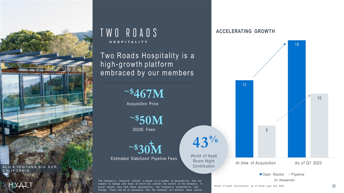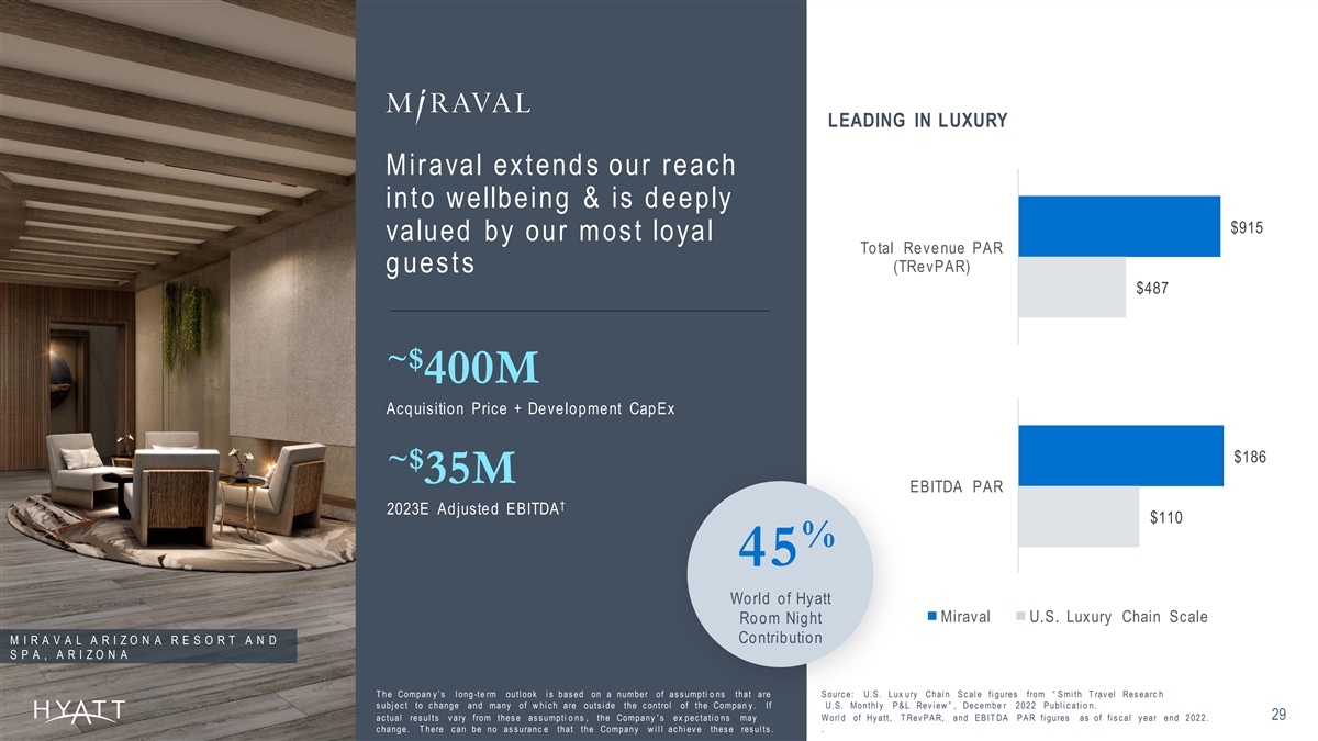 LEADING IN LUXURY Miraval ext end s our reach int o wellbeing & is d eeply $915 valued by our most loyal Total Revenue PAR (TRevPAR) g uest s $487 ~$ 400M Acquisition Price + Development CapEx $186 ~$ 35M EBITDA PAR † 2023E Adjusted EBITDA $110 % 45 World of Hyatt Miraval U.S. Luxury Chain Scale Room Night Contribution M I R A V A L A R I Z O N A R E S O R T A N D S P A , A R I Z O N A T he Compan y ’ s l ong -te rm outl ook i s bas ed on a number of as s umpti o ns that are S ourc e: U.S . Lux ury Chai n S c al e fi gures from “ S mi th T rav el Res earc h s ubj ec t to c hange and many of w hi c h are outs i de the c ontrol of the Compan y . If U.S . Monthl y P & L Rev i ew ” , Dec embe r 2022 P ubl i c ati o n. 29 ac tual res ul ts v ary from thes e as s umpti o ns , the Company ' s ex pec tati o ns may W orl d of Hy att, T Rev P A R, and E B IT DA P A R fi gures as of fi s c al y ear end 2022. c hange. T here c an be no as s uranc e that the Company w i l l ac hi ev e thes e res ul ts . .