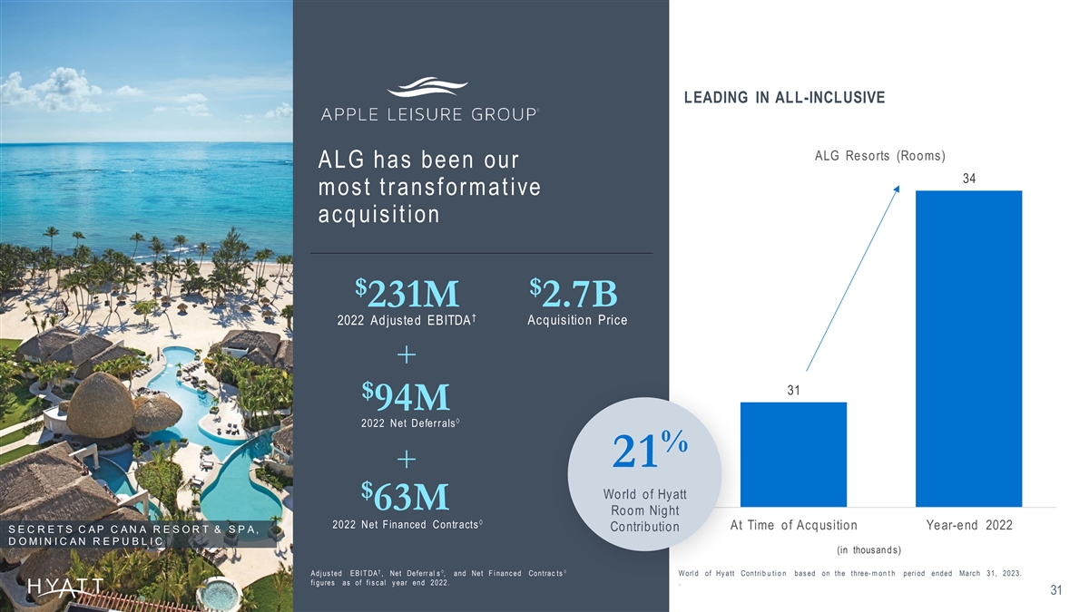 LEADING IN ALL-INCLUSIVE ALG Resorts (Rooms) ALG has been our 34 most t ransf ormat ive acq uisit ion $ $ 231M 2.7B † 2022 Adjusted EBITDA Acquisition Price + 31 $ 94M à 2022 Net Deferrals % 21 + $ World of Hyatt 63M Room Night à 2022 Net Financed Contracts At Time of Acqusition Year-end 2022 Contribution S E C R E T S C A P C A N A R E S O R T & S P A , D O M I N I C A N R E P U B L I C (in thousan d s) †àà A dj us ted E B IT DA , Net Deferr al s , and Net F i nanc ed Contrac ts W orl d of Hy att Contri b u ti o n bas ed on the three- m on t h peri od ended Marc h 31, 2023. fi gures as of fi s c al y ear end 2022. . 31