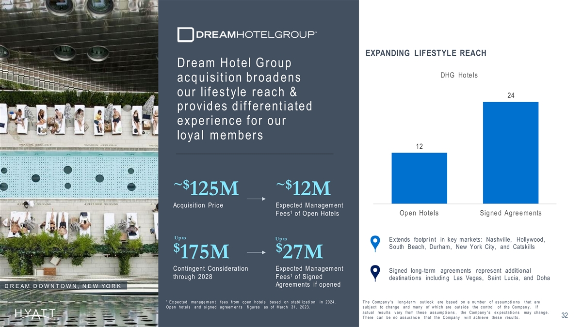 EXPANDING LIFESTYLE REACH Dream Hot el G roup DHG Hotels acq uisit ion broad ens our lif est yle reach & 24 provid es d if f erent iated experience f or our loyal members 12 ~$ ~$ 125M 12M Ac quisition Pric e Expec ted Management 1 Fees of Open Hotels Open Hotels Signed Agreements Up to Up to Extends footpr in t in key markets: Nashville, Hollywood , South Beach, Durham, New York City, and Catskills $ $ 175M 27M Contingent Consideration Expec ted M anagement Signed long-term agreements represent additio na l 1 through 2028 Fees of Signed destinations including Las Vegas, Saint Lucia, and Doha Agreements if opened D R E A M D O W N T O W N , N E W Y O R K 1 E x pec ted manage m en t fees from open hotel s bas ed on s tabi l i z ati on i n 2024. T he Compan y 's l ong-ter m outl ook are bas ed on a number of as s umpti o ns that are O pen hotel s and s i gned agreem en ts fi gures as of Marc h 31, 2023. s ubj ec t to c hange and many of w hi c h are outs i de the c ontrol of the Compan y . If ac tual res ul ts v ary from thes e as s umpti o ns , the Company ' s ex pec tati o ns may c hange. 32 T here c an be no as s uranc e that the Company w i l l ac hi ev e thes e res ul ts .