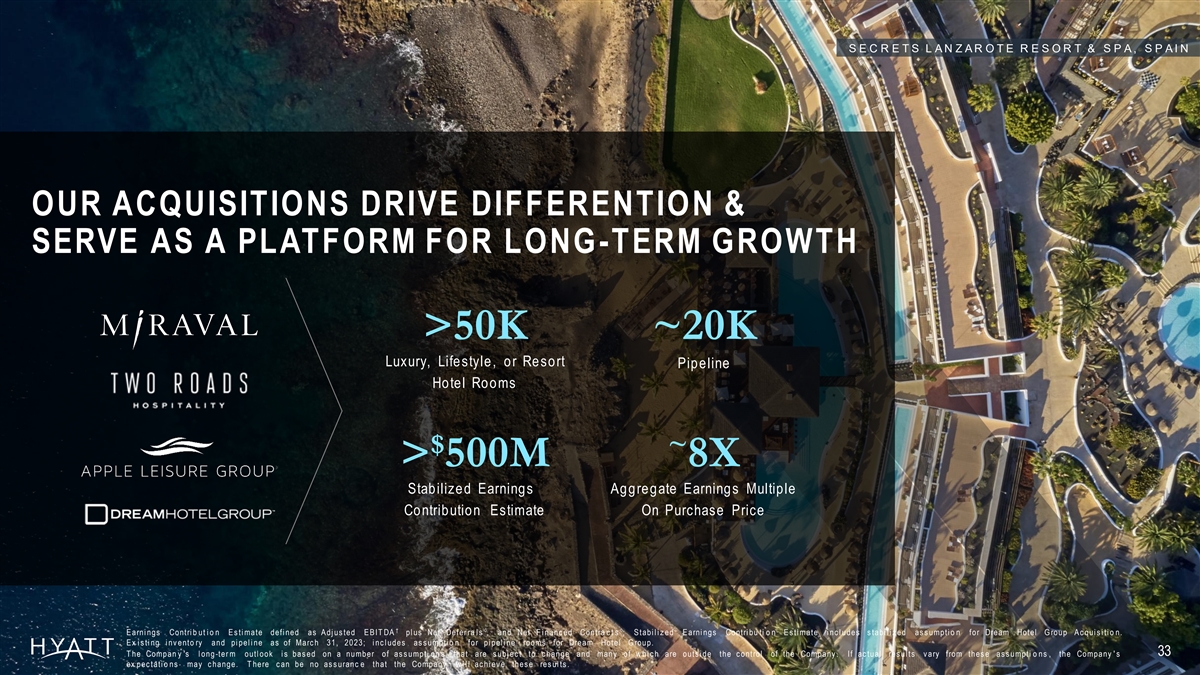 S E C R E T S L A N Z A R O T E R E S O R T & S P A , S P A I N OUR ACQUISITIONS DRIVE DIFFERENTION & SERVE AS A PLATFORM FOR LONG-TERM GROWTH >50K ~20K Luxury, Lifestyle, or Resort Pipeline Hotel Rooms $ ~ > 500M 8X Stabilized Earnings Aggregate Earnings Multiple Contribution Estimate On Purchase Price †àà E arni ngs Contri b ut i o n E s ti mate defi ned as A dj us ted E B IT DA pl us Net Defer ra l s , and Net F i nanc ed Contra c t s ; S tabi l i z ed E arni ngs Contri bu ti o n E s ti mate i nc l udes s tabi l i z ed as s umpti o n for Dream Hotel G roup A c qui s i ti o n. E x i s ti ng i nv ento ry and pi pel i ne as of Marc h 31, 2023; i nc l udes as s umpti o n for pi pel i ne rooms for Dream Hotel G roup. 33 T he Compan y 's l ong -ter m outl ook i s bas ed on a number of as s umpti on s that are s ubj ec t to c hange and many of w hi c h are outs i de the c ontrol of the Company . If ac tual res ul ts v ary from thes e as s umpti o ns , the Company ' s ex pec tati o ns may c hange. T here c an be no as s uranc e that the Company w i l l ac hi ev e thes e res ul ts .