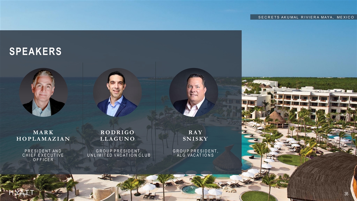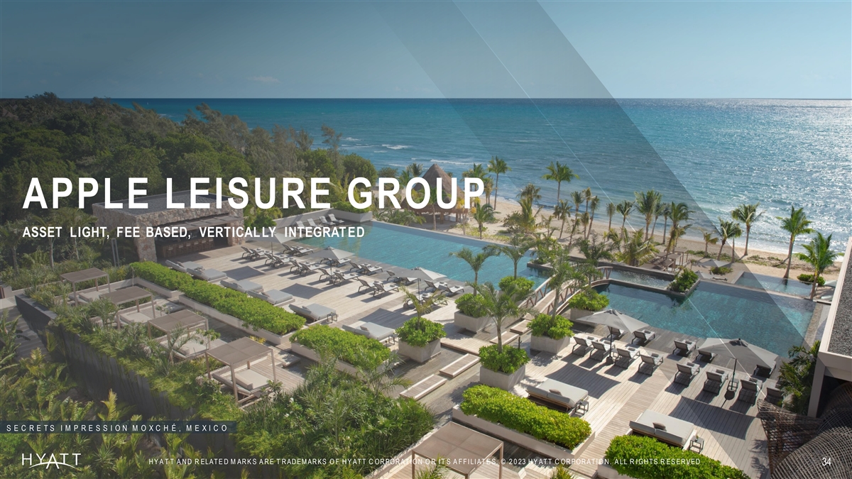 APPLE LEISURE GROUP ASSET LIGHT, FEE BASED, VERTICAL LY INTEGRAT ED S E C R E T S I M P R E S S I O N M O X C H É , M E X I C O H Y A T T A N D R ELAT E D M AR K S A R E T R AD EM AR KS O F H Y AT T C OR POR AT I ON O R I T S A F F I LI AT E S. © 2 0 23 H Y AT T C OR POR AT I O N . A LL R I GH T S R ES ER VED . 34