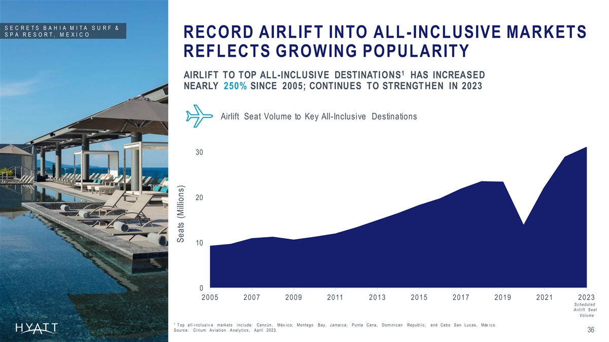 S E C R E T S B A H I A M I T A S U R F & S P A R E S O R T , M E X I C O RECORD AIRLIFT INTO ALL -INCLUSIVE MARKETS REFLECTS GROWING POPULARITY 1 AIRLIFT TO TOP ALL-INCLUSIVE DESTINATIONS HAS INCREASED NEARLY 250% SINCE 2005; CONTINUES TO STRENGT HEN IN 2023 Airlift Seat Volume to Key All-Inclusive Destinations 30 20 10 0 2005 2007 2009 2011 2013 2015 2017 2019 2021 2023 S c hedul ed A i rl i ft S eat V ol ume 1 T op al l -i nc l us i v e mark ets i nc l ude: Canc ún , Méx i c o; Montego B ay , J amai c a; P unta Cana, Domi ni c an Republ i c ; and Cabo S an Luc as , Méx i c o. S ourc e: Ci ri um A v i ati on A nal y ti c s , A pri l 2023. 36 Seats (Millions)
