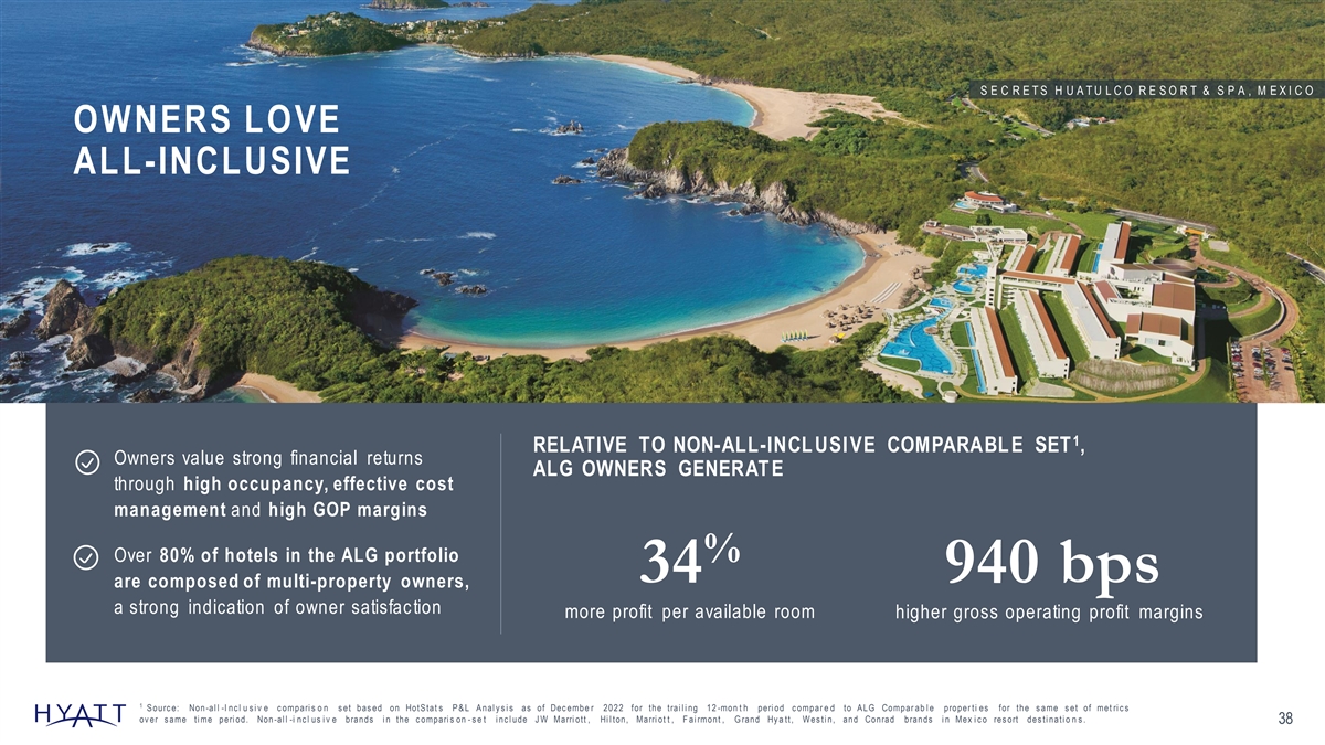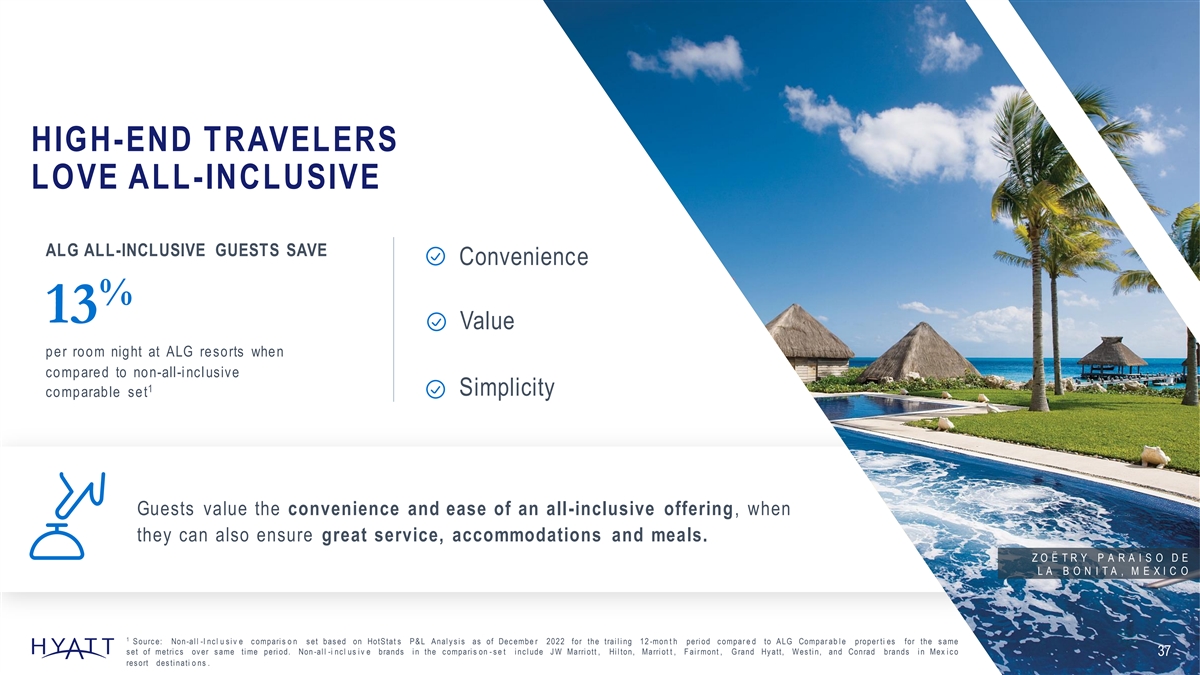 HIGH-END TRAVELERS LOVE ALL-INCLUSIVE ALG ALL-INCLUSIVE GUESTS SAVE Convenience % 13 Value per room night at ALG resorts when compared to non-all-i ncl usive 1 Simplicity comparable set Guests value the convenience and ease of an all-inclusive offering, when they can also ensure great service, accommodations and meals. Z O Ë T R Y P A R A I S O D E L A B O N I T A , M E X I C O 1 S ourc e: Non -al l -I nc l u s i v e c ompari s o n s et bas ed on HotS tat s P & L A nal y s i s as of Dec embe r 2022 for the trai l i ng 12 -mon t h peri od c ompar e d to A LG Compar ab l e proper ti es for the s ame s et of metri c s ov er s ame ti me peri od. Non -al l -i nc l us i v e brands i n the c ompari s on - s e t i nc l ude J W Marri ott , Hi l ton, Marri ot t , F ai r mont , G rand Hy att, Wes ti n, and Conrad brands i n Mex i c o 37 res ort des ti nati o ns .