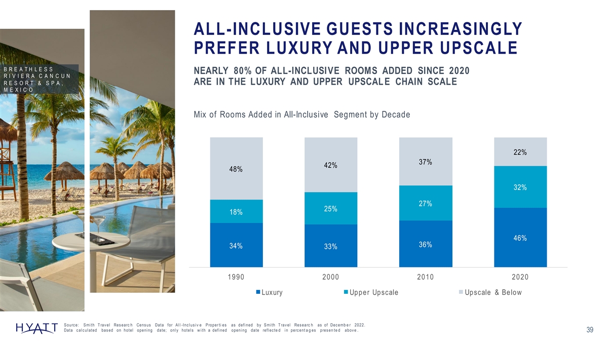 ALL-INCLUSIVE GUESTS INCREASINGLY PREFER LUXURY AND UPPER UPSCALE B R E A T H L E S S NEARLY 80% OF ALL-INCLUSIVE ROOMS ADDED SINCE 2020 R I V I E R A C A N C U N R E S O R T & S P A , ARE IN THE LUXURY AND UPPER UPSCAL E CHAIN SCALE M E X I C O Mix of Rooms Added in All-Inclusive Segment by Decade 22% 37% 42% 48% 32% 27% 25% 18% 46% 36% 34% 33% 1990 2000 2010 2020 Luxury Upper Upscale Upscale & Below S ourc e: S mi th T rav el Res earc h Cens us Data for A l l -Inc l us i v e P roper ti es as defi ned by S mi th T rav el Res earc h as of Dec emb e r 2022. Data c al c ul ated bas ed on hotel openi ng date; onl y hotel s w i th a defi ned openi ng date refl ec te d i n perc ent a g es pres en te d abov e . 39