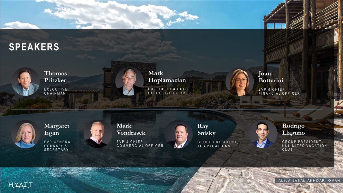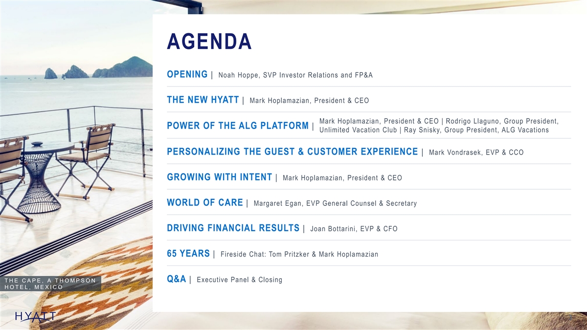 AGENDA OPENING | Noah Hoppe, SVP Investor Relations and FP&A THE NEW HYATT | Mark Hoplamazian, President & CEO Mark Hoplamazian, President & CEO | Rodrigo Llaguno, Group President, POWER OF THE ALG PLATFORM | Unlimited Vacation Club | Ray Snisky, Group President, ALG Vacations PERSONALIZING THE GUEST & CUSTOMER EXPERIENCE | Mark Vondrasek, EVP & CCO GROWING WITH INTENT | Mark Hoplamazian, President & CEO WORLD OF CARE | Margaret Egan, EVP General Counsel & Secretary DRIVING FINANCIAL RESULTS | Joan Bottarini, EVP & CFO 65 YEARS | Fireside Chat: Tom Pritzker & Mark Hoplamazian THE CAPE, A THOMPSON Q&A | Executive Panel & Closing HOTEL, MEXICO 3