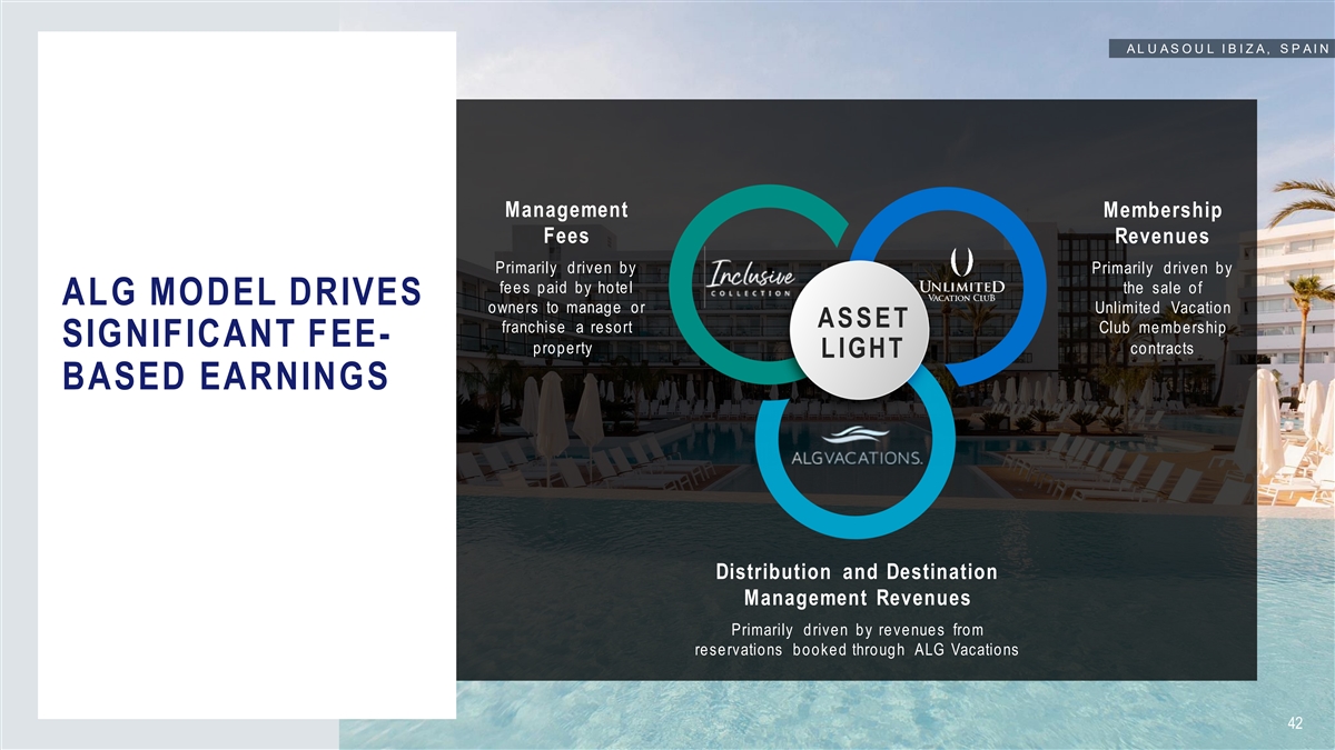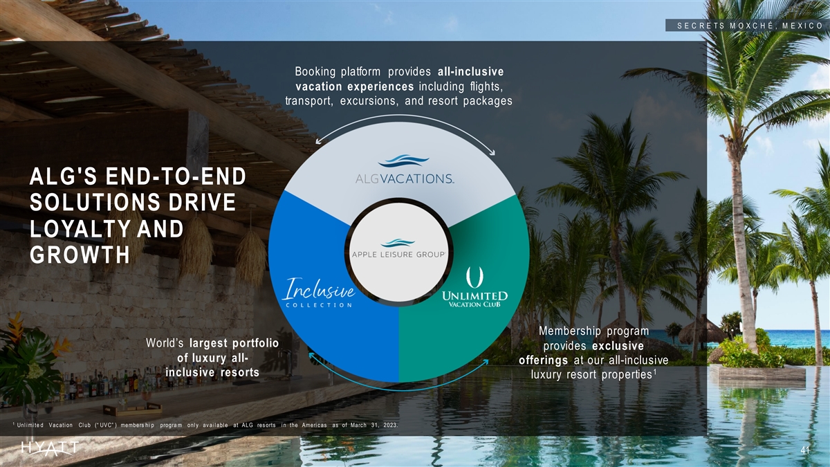 S E C R E T S M O X C H É , M E X I C O Booking platform provides all-inclusive vacation experiences including flights, transport, excursions, and resort packages ALG'S END-TO-END SOLUTIONS DRIVE LOYALTY AND GROWTH Membership program World’s largest portfolio provides exclusive of luxury all- offerings at our all-inclusive 1 inclusive resorts luxury resort properties 1 Unl i mi te d V ac ati on Cl ub (“ UV C” ) members hi p progra m onl y av ai l abl e at A LG res orts i n the A meri c as as of Marc h 31, 2023. 41