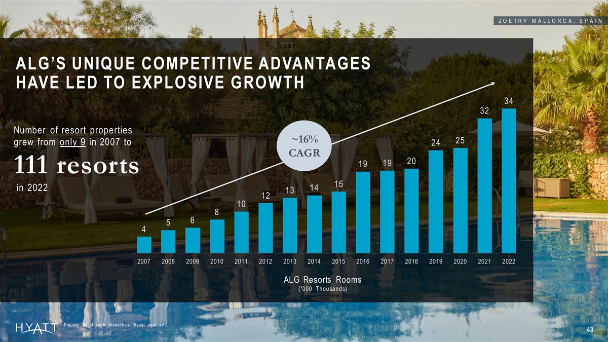 Z O Ë T R Y M A L L O R C A , S P A I N ALG’S UNIQUE COMPETITIVE ADVANTAGES HAVE LED TO EXPLOSIVE GROWTH 34 32 Number of resort properties ~16% 25 grew from only 9 in 2007 to 24 CAGR 20 19 19 111 resorts 15 14 in 2022 13 12 10 8 6 5 4 2007 2008 2009 2010 2011 2012 2013 2014 2015 2016 2017 2018 2019 2020 2021 2022 ALG Resorts Rooms ('000 T housands) F i gures as of eac h res pec ti v e fi s c al y ear end. 43