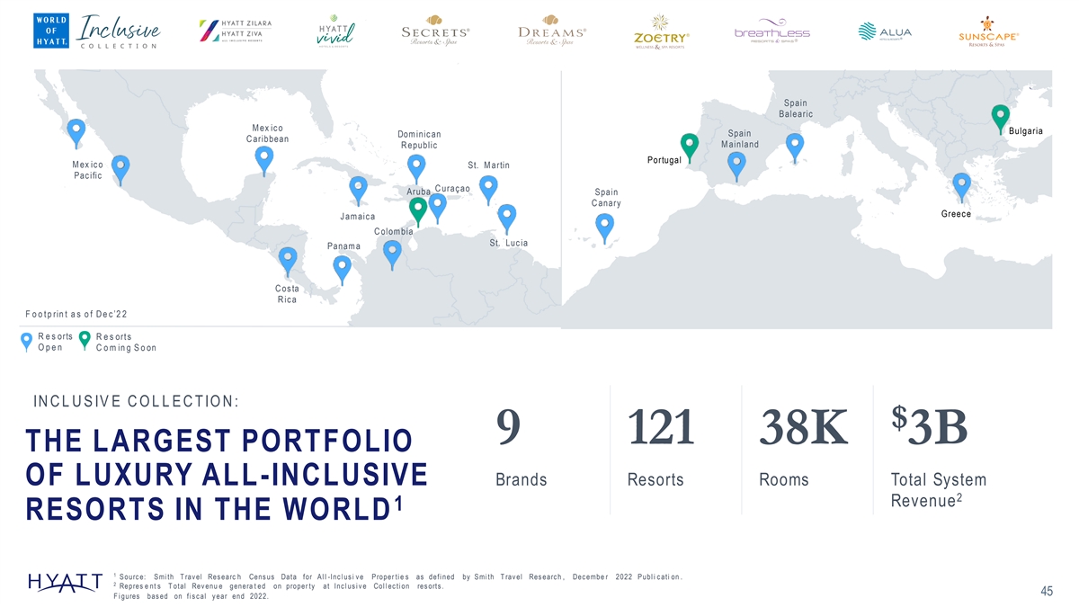 Spain Balearic M ex ic o Bulgaria Dom inic an Spain C aribbean M ainland R epublic Portugal M ex ic o St. M artin Pac ific C uraç ao Aruba Spain C anary Greec e J am aic a C olom bia St. Luc ia Panam a C os ta R ic a F o o t p rin t a s o f D e c ’2 2 R e s orts R e s ort s Open C o m in g S o on IN C L U S IV E C O L L E C T IO N : $ 9 121 38K 3B THE LARGEST PORTFOLIO OF LUXURY ALL-INCLUSIVE Brands Resorts Rooms Total System 2 Revenue 1 RESORTS IN THE WORLD 1 S ourc e: S mi th T rav el Res earc h Cens us Data for A l l -Inc l us i v e P roper ti e s as defi ned by S mi th T rav el Res earc h , Dec embe r 2022 P ubl i c ati on . 2 Repres e nt s T otal Rev enu e genera t ed on proper ty at Inc l us i v e Col l ec ti on res orts . 45 F i gures bas ed on fi s c al y ear end 2022.