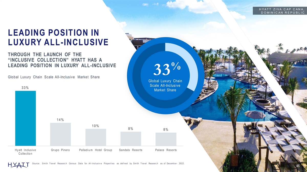 H Y A T T Z I V A C A P C A N A , D O M I N I C A N R E P U B L I C LEADING POSITION IN LUXURY ALL-INCLUSIVE THROUGH THE LAUNCH OF THE “INCLUSIVE COLLECTION” HYATT HAS A LEADING POSITION IN LUXURY ALL-INCLUSIVE % 33 Global Luxury Chain Scale All-Inclusive Market Share Global Luxury Chain Scale All-Inclusive 33% Market Share 14% 10% 8% 8% Hy att Inclus iv e Grupo Pinero Palladi u m Hotel Group Sandals Resorts Palace Resorts Collec tio n S ourc e: S mi th T rav el Res earc h Cens us Data for A l l -Inc l us i v e P roper ti es as defi ned by S mi th T rav el Res earc h as of Dec emb e r 2022. 46