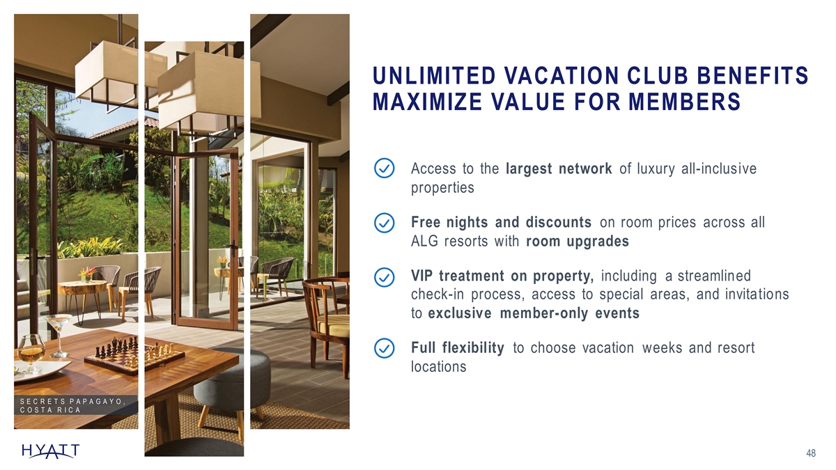 UNLIMITED VACATION CLUB BENEFITS MAXIMIZE VALUE FOR MEMBERS Access to the largest network of luxury all-inclusive properties Free nights and discounts on room prices across all ALG resorts with room upgrades VIP treatment on property, including a streamlined check-in process, access to special areas, and invitations to exclusive member-only events Full flexibility to choose vacation weeks and resort locations S E C R E T S P A P A G A Y O , C O S T A R I C A 48