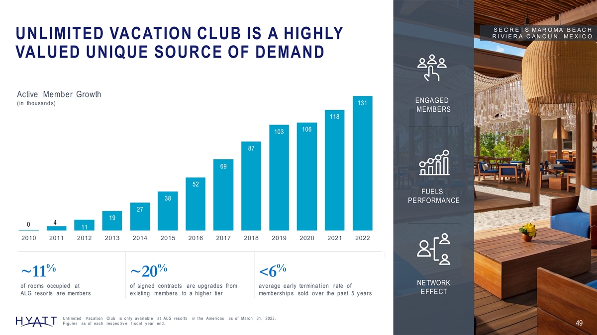S E C R E T S M A R O M A B E A C H R I V I E R A C A N C U N , M E X I C O UNLIMITED VACATION CLUB IS A HIGHLY VALUED UNIQUE SOURCE OF DEMAND Active Member Growth ENGAGED (in thousand s) 131 MEMBERS 118 106 103 87 69 52 FUELS 38 PERFORMANCE 27 19 4 0 11 2010 2011 2012 2013 2014 2015 2016 2017 2018 2019 2020 2021 2022 % % % ~11 ~20 <6 NETWORK of rooms occupied at of signed contrac ts are upgrades from av erage early termina ti on rate of EFFECT ALG resorts are members ex isting members to a higher tier membersh ip s sold ov er the past 5 y ears Unl i mi ted V ac ati on Cl ub i s onl y av ai l abl e at A LG res orts i n the A meri c as as of Marc h 31, 2023. F i gures as of eac h res pec ti v e fi s c al y ear end. 49