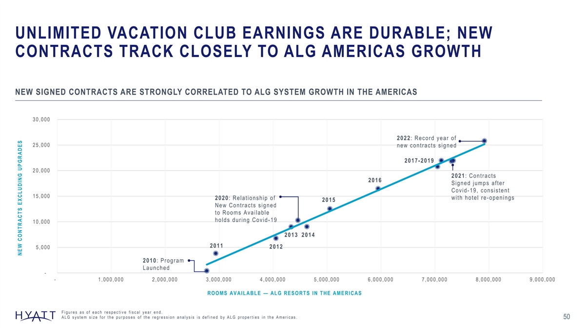 UNLIMITED VACATION CLUB EARNINGS ARE DURABLE; NEW CONTRACTS TRACK CLOSELY TO ALG AMERICAS GROWTH NEW SIGNED CONTRACTS ARE STRONGLY CORRELATED TO ALG SYSTEM GROWTH IN THE AMERICAS 30, 000 2022: Record year of 25, 000 new contracts signed 2017-2019 20, 000 2021: Contracts 2016 Signed jumps after Covid-19, consistent 15, 000 2020: Relationship of with hotel re- openings 2015 New Contracts signed to Rooms Available holds during Covid- 19 10, 000 2013 2014 2011 2012 5, 000 2010: Program Launched - - 1, 000, 000 2, 000, 000 3, 000, 000 4, 000, 000 5, 000, 000 6, 000, 000 7, 000, 000 8, 000, 000 9, 000, 000 ROOMS AVAILABLE — ALG RESORTS IN THE AMERICAS Figures as of each respective fiscal year end. ALG system size for the purposes of the regression analysis is defined by ALG properties in the Americas. 50 NEW CONTRACTS EXCLUDING UPGRADES