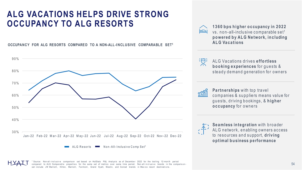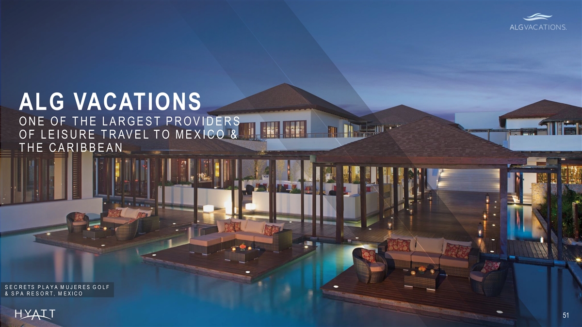 ALG VACATIONS HELPS DRIVE STRONG OCCUPANCY TO ALG RESORTS 1 3 6 0 b p s h ig her o c cupancy in 2 0 2 2 1 vs . n o n -a ll-inclu sive c o mparable s e t p o wered b y AL G Ne twork, in c luding AL G Va c a tions 1 OCCUPANCY FOR ALG RESORTS COMPARE D TO A NON-ALL -I NCL USIVE COMPARABL E SET 90% AL G Va c atio ns d rive s e ffo rtless b o o king e x perienc es fo r g u e s ts & 80% s te a d y d e man d g e neratio n fo r o wn ers 70% Pa rtn erships with to p tra ve l 60% c o mp anies & s u p p lie rs me ans va lu e fo r g u e s ts , d rivin g b o okings , & h ig h er o c c upancy fo r o wn e rs 50% 40% Se a mless in te gration with b ro a der AL G n e two rk , e n abling o wn ers a c c ess 30% to re s o urces a n d s u ppo rt, d riv ing J an -22 F e b -22 M ar -22 A pr -22 M ay -22 J un -22 J ul-22 A ug -22 S e p -22 O c t-22 N ov -22 D ec -22 o p timal b u siness p e rformance 1 A L G R e s o r ts N o n - A l l - I nc l u s i v e C o mp S e t 1 S ourc e: Non -al l -i nc l us i v e c ompari s on s et bas ed on HotS tats P & L A nal y s i s as of Dec emb e r 2022 for the trai l i ng 12 -mon th peri od c ompare d to A LG Compar a bl e properti e s for the s ame s et of metri c s ov er s ame ti me peri od. Non -al l - i n c l us i v e brands i n the c ompari s o n - 54 s et i nc l ude J W Marri ot t , Hi l ton, Marri ot t, F ai rmont , G rand Hy att, Wes ti n, and Conrad brands i n Mex i c o res ort des ti nati o ns .