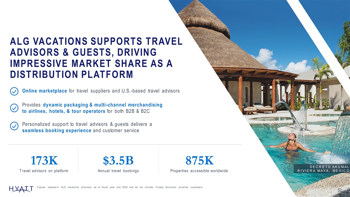 ALG VACATIONS SUPPORTS TRAVEL ADVISORS & GUESTS, DRIVING IMPRESSIVE MARKET SHARE AS A DISTRIBUTION PLATFORM Online marketplace for travel suppliers and U.S.-based travel advisors Provides dynamic packaging & multi-channel merchandising to airlines, hotels, & tour operators for both B2B & B2C Personalized support to travel advisors & guests delivers a seamless booking experience and customer service 173K $3.5B 875K S E C R E T S A K U M A L R I V I E R A M A Y A , M E X I C O T ravel advisors on platform Annual travel bookings Properties ac c essible worldwide F i gures repres e nt A LG V ac ati ons bus i nes s as of fi s c al y ear end 2022 and do not i nc l ude T ri s ept S ol uti ons ex ternal c us tomer s . 52