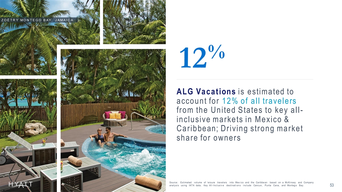 Z O Ë T R Y M O N T E G O B A Y , J A M A I C A % 12 ALG Vacations is estimated to account for 12% of all travelers from the United States to key all- inclusive markets in Mexico & Caribbean; Driving strong market share for owners S ourc e: E s ti mated v ol ume of l ei s ure trav el ers i nto Mex i c o and the Cari bbe an bas ed on a Mc K i ns ey and Company anal y s i s us i ng IA T A data; K ey A l l -Inc l us i v e des ti nati on s i nc l ude Canc un, P unta Cana, and Monteg o B ay . 53 .