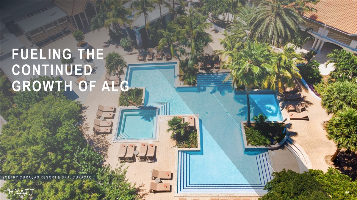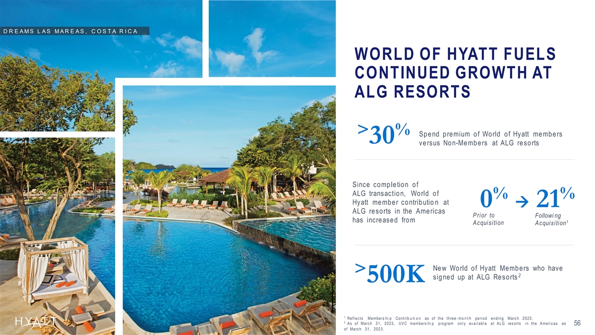 D R E A M S L A S M A R E A S , C O S T A R I C A WORLD OF HYATT FUELS CONTINUED GROWTH AT ALG RESORTS > % Spend premium of World of Hyatt members 30 versus Non-Members at ALG resorts Since completion of ALG transaction, World of % % Hyatt member contributio n at 0 → 21 ALG resorts in the Americas Prior to Followi ng has increased from 1 Acquisition Acquisition New World of Hyatt Members who have > 2 signed up at ALG Resorts 500K 1 Refl ec ts Members hi p Contri b u ti o n as of the three - mo n t h peri od endi ng Marc h 2023. 2 A s of Marc h 31, 2023, UV C members hi p program onl y av ai l abl e at A LG res orts i n the A meri c as as 56 of Marc h 31, 2023.