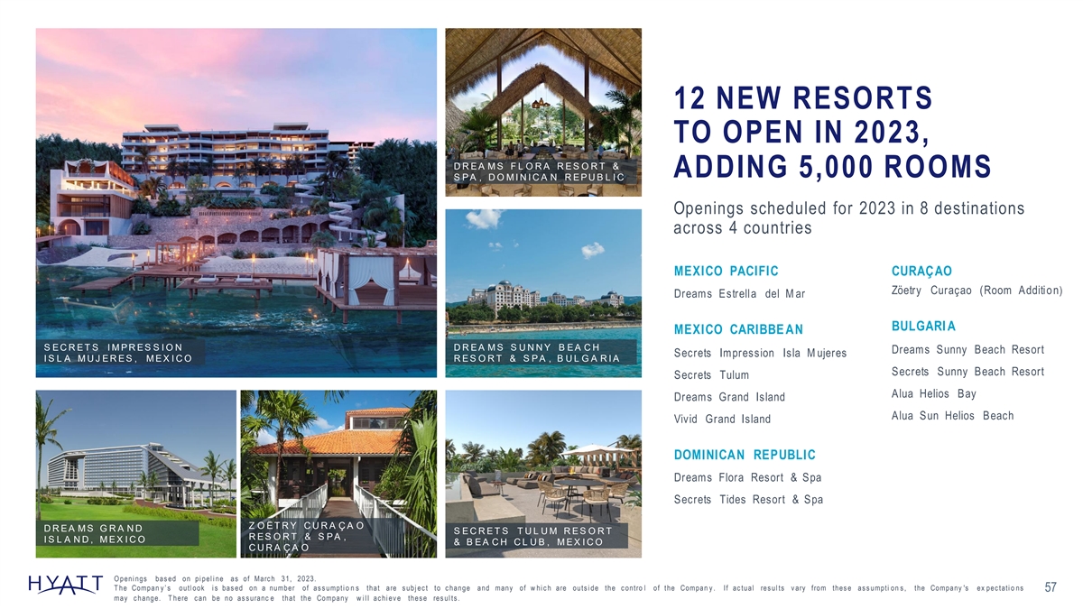12 NEW RESORTS TO OPEN IN 2023, D R E A M S F L O R A R E S O R T & ADDING 5,000 ROOMS S P A , D O M I N I C A N R E P U B L I C Openings scheduled for 2023 in 8 destinations across 4 countries MEXICO PACIFIC CURAÇAO Zöetry Curaçao (Room Addition) Dreams Estrella del M ar BULGARI A MEXICO CARIBBE AN S E C R E T S I M P R E S S I O N D R E A M S S U N N Y B E A C H Dreams Sunny Beach Resort Secrets Impression Isla M ujeres I S L A M U J E R E S , M E X I C O R E S O R T & S P A , B U L G A R I A Secrets Sunny Beach Resort Secrets Tulum Alua Helios Bay Dreams Grand Island Alua Sun Helios Beach Vivid Grand Island DOMINICAN REPUBLIC Dreams Flora Resort & Spa Secrets Tides Resort & Spa Z O Ë T R Y C U R A Ç A O D R E A M S G R A N D S E C R E T S T U L U M R E S O R T R E S O R T & S P A , I S L A N D , M E X I C O & B E A C H C L U B , M E X I C O C U R A Ç A O O peni ngs bas ed on pi pel i ne as of Marc h 31, 2023. T he Compan y ’ s outl ook i s bas ed on a number of as s umpti o n s that are s ubj ec t to c hange and many of w hi c h are outs i de the c ontro l of the Compan y . If ac tual res ul ts v ary from thes e as s umpti on s , the Company 's ex pec tati o ns 57 may c hange. T here c an be no as s uranc e that the Company w i l l ac hi ev e thes e res ul ts .