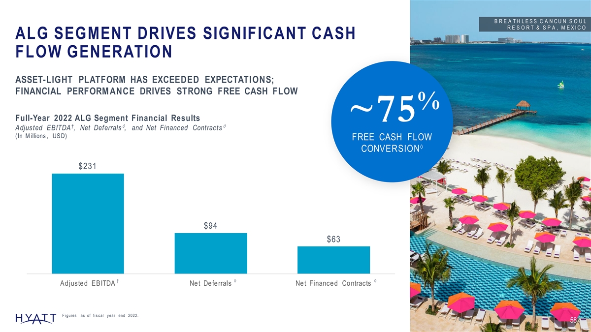 B R E A T H L E S S C A N C U N S O U L R E S O R T & S P A , M E X I C O ALG SEGMENT DRIVES SIGNIFICANT CASH FLOW GENERATION ASSET-LIGHT PLATFORM HAS EXCEEDED EXPECTATIONS; FINANCIAL PERFORM ANCE DRIVES STRONG FREE CASH FLOW % Full-Year 2022 ALG Segment Financial Results ~75 †àà Adjusted EBITDA , Net Deferrals , and Net Financed Contracts (In M illions , USD) FREE CASH FLOW à CONVERSION $231 $94 $63 †àà Adjusted EBITDA Net Deferrals Net Financed Contracts F i gures as of fi s c al y ear end 2022. 58