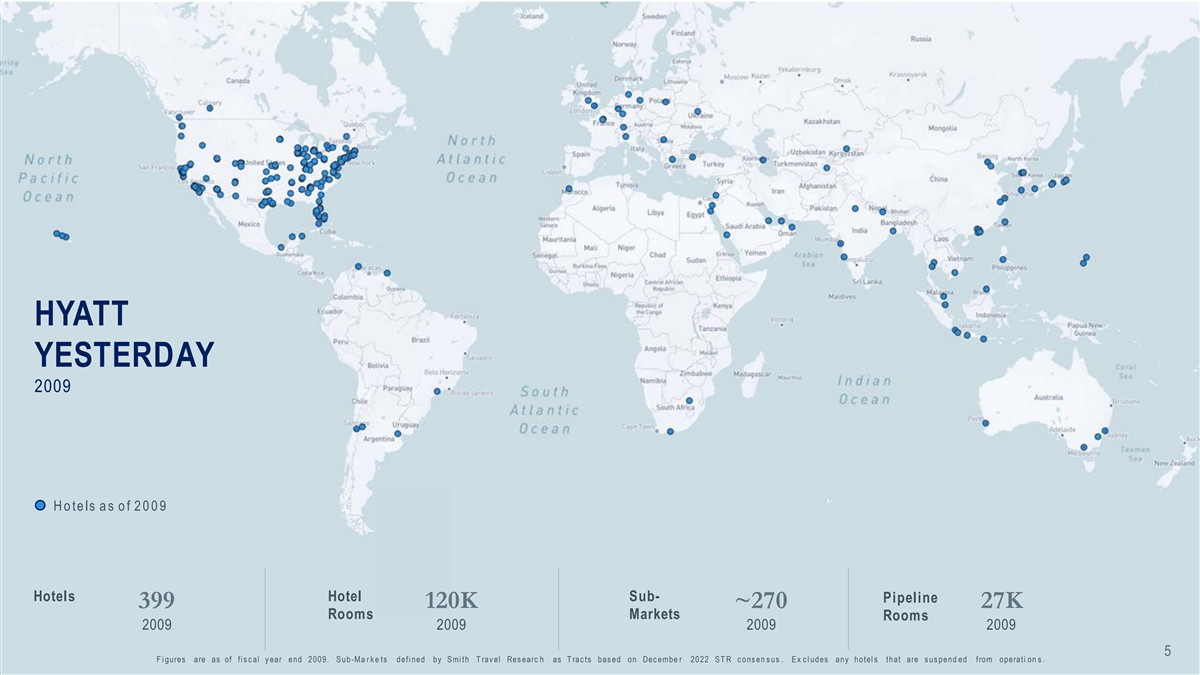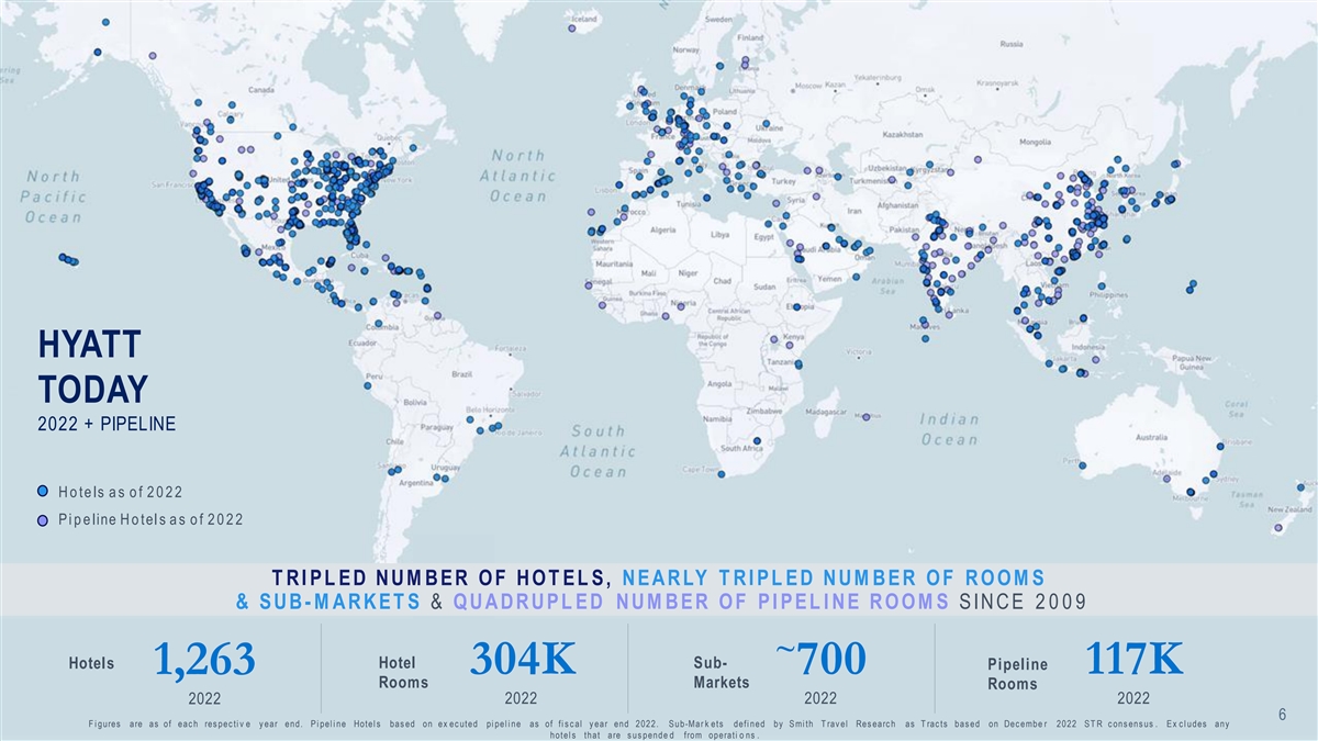 HYATT YESTERDAY 2009 H o te ls a s o f 2 0 0 9 Hotels Hotel Sub- Pipeline 399 120K ~270 27K Rooms Markets Rooms 2009 2009 2009 2009 5 F i gures are as of fi s c al y ear end 2009. S ub -Ma r k e ts defi ned by S mi th T rav el Res earc h as T rac ts bas ed on Dec embe r 2022 S T R c ons en s us . E x c l udes any hotel s that are s us pend ed from operati on s .