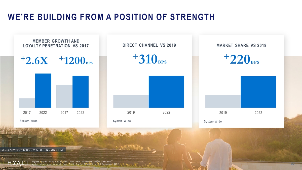 WE’RE BUILDING FROM A POSITION OF STRENGTH MEMBER GROWTH AND DIRECT CHANNEL VS 2019 MARKET SHARE VS 2019 LOYALTY PENETRATION VS 2017 + + + + 310BPS 220BPS 2.6X 1200BPS 2019 2022 2017 2022 2017 2022 2019 2022 Sy stem- W i de Sy stem- W i de Sy stem- W i de A L I L A V I L L A S U L U W A T U , I N D O N E S I A F i gures bas ed on and c al c ul ated from eac h res pec ti v e fi s c al y ear end. Mark et s hare data s ourc ed from S mi th T rav el Res earc h as of Dec embe r 2022. 62