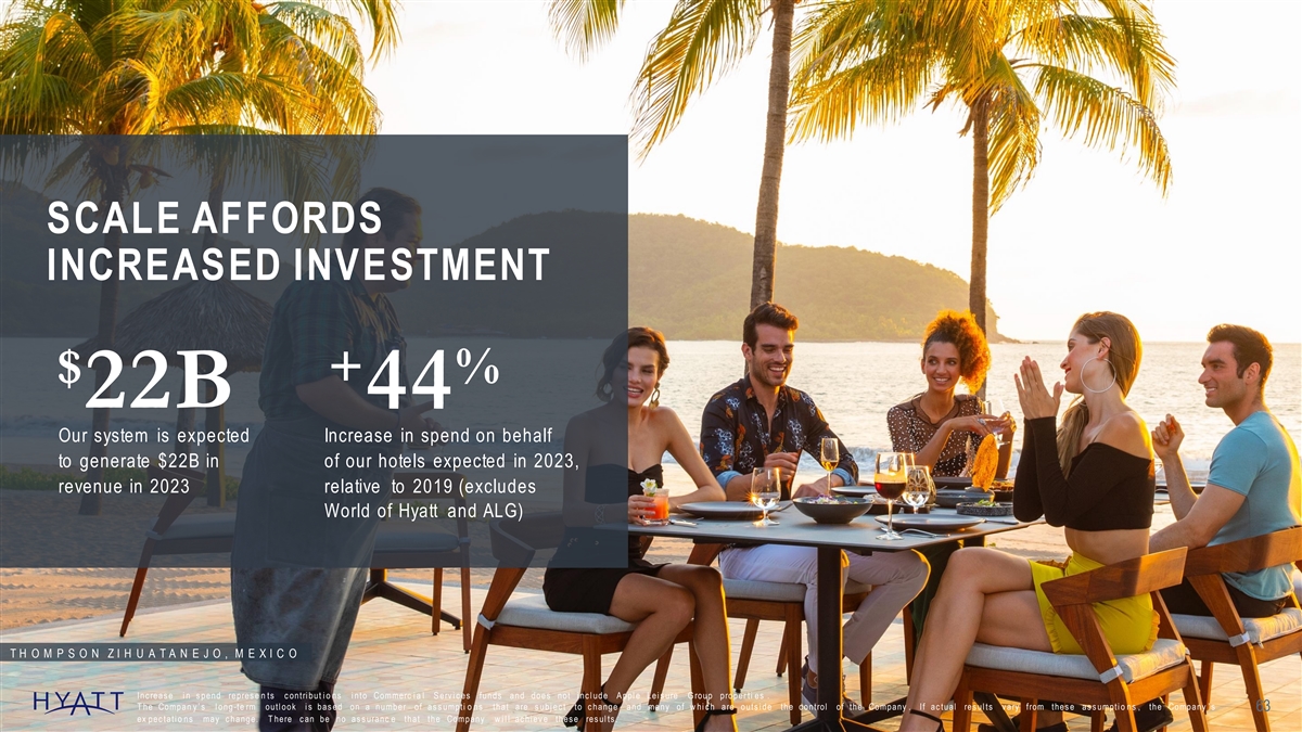 SCALE AFFORDS INCREASED INVESTMENT $ + % 22B 44 Our system is expected Increase in spend on behalf to generate $22B in of our hotels expected in 2023, revenue in 2023 relative to 2019 (excludes World of Hyatt and ALG) T H O M P S O N Z I H U A T A N E J O , M E X I C O Inc reas e i n s pend repres e n ts c ontri but i o ns i nto Commerc i a l S erv i c es funds and does not i nc l ude A ppl e Lei s ure G roup proper ti es . T he Compan y ’ s l ong -te rm outl ook i s bas ed on a number of as s umpti o ns that are s ubj ec t to c hange and many of w hi c h are outs i de the c ontrol of the Company . If ac tual res ul ts v ary from thes e as s umpti o ns , the Company ’ s 63 ex pec tati o ns may c hange. T here c an be no as s uranc e that the Company w i l l ac hi ev e thes e res ul ts .