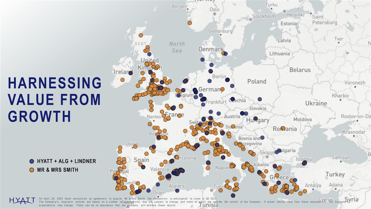 HARNESSING VALUE FROM GROWTH O n A pri l 28, 2023 Hy att announc e d an agreem e n t to ac qui re Mr & Mrs S mi th; the trans ac ti o n i s anti c i pat ed to c l os e i n Q2 2023. T he Compan y 's l ong -ter m outl ook are bas ed on a number of as s umpti o ns that are s ubj ec t to c hange and many of w hi c h are outs i de the c ontrol of the Company . If ac tual res ul ts v ary from thes e as s umpti o ns , the Company ' s 66 ex pec tati o ns may c hange. T here c an be no as s uranc e that the Company w i l l ac hi ev e thes e res ul ts .