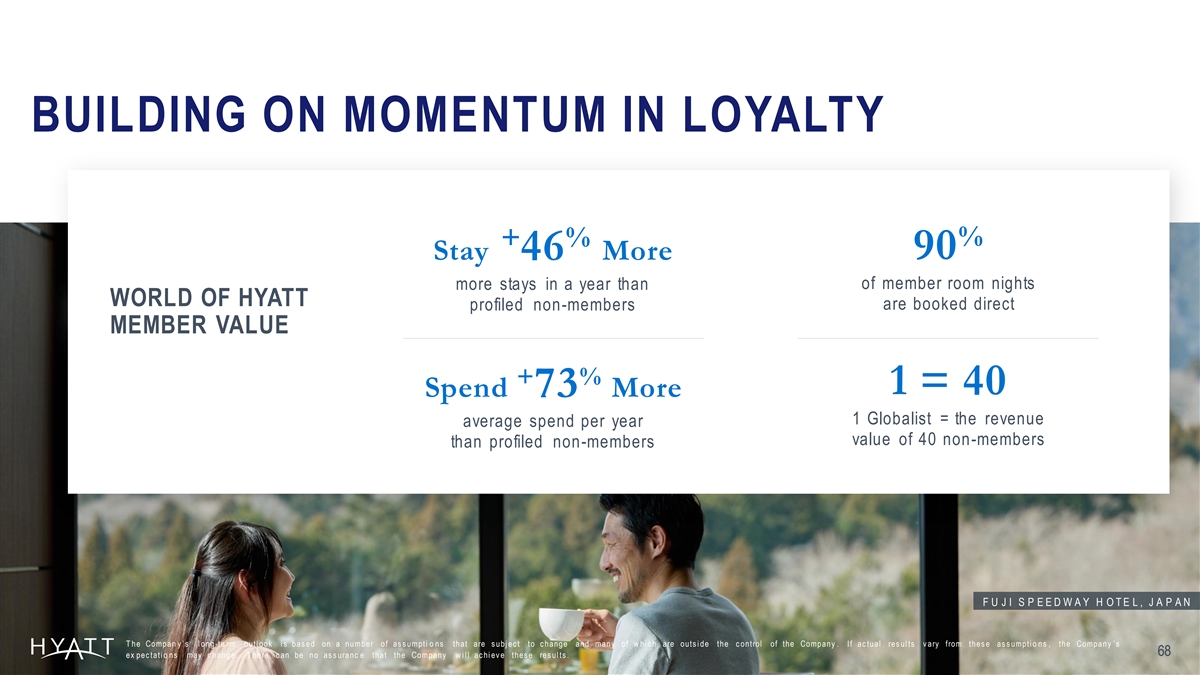 BUILDING ON MOMENTUM IN LOYALTY % + % 90 Stay 46 More of member room nights more stays in a year than WORLD OF HYATT are booked direct profiled non-members MEMBER VALUE + % 1 = 40 Spend 73 More 1 Globalist = the revenue average spend per year value of 40 non-members than profiled non-members F U J I S P E E D W A Y H O T E L , J A P A N T he Compan y ’ s l ong -te rm outl ook i s bas ed on a number of as s umpti o ns that are s ubj ec t to c hange and many of w hi c h are outs i de the c ontrol of the Company . If ac tual res ul ts v ary from thes e as s umpti o ns , the Company ’ s 68 68 68 ex pec tati o ns may c hange. T here c an be no as s uranc e that the Company w i l l ac hi ev e thes e res ul ts .