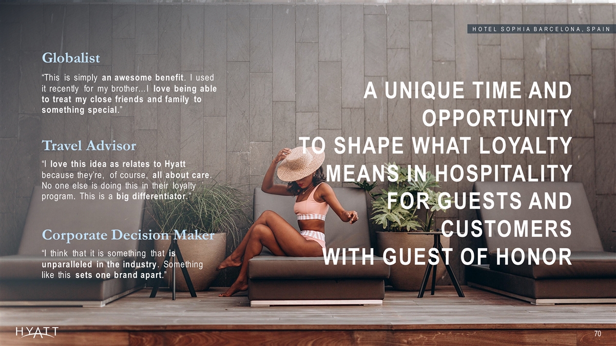 H O T E L S O P H I A B A R C E L O N A , S P A I N Globalist “This is simply an awesome benefit. I used it recently for my brother…I love being able A UNIQUE TIME AND to treat my close friends and family to something special.” OPPORTUNITY Travel Advisor TO SHAPE WHAT LOYALTY “I love this idea as relates to Hyatt because they’re, of course, all about care. MEANS IN HOSPITALITY No one else is doing this in their loyalty program. This is a big differentiator.” FOR GUESTS AND CUSTOMERS Corporate Decision Maker “I think that it is something that is WITH GUEST OF HONOR unparalleled in the industry. Something like this sets one brand apart.” 70