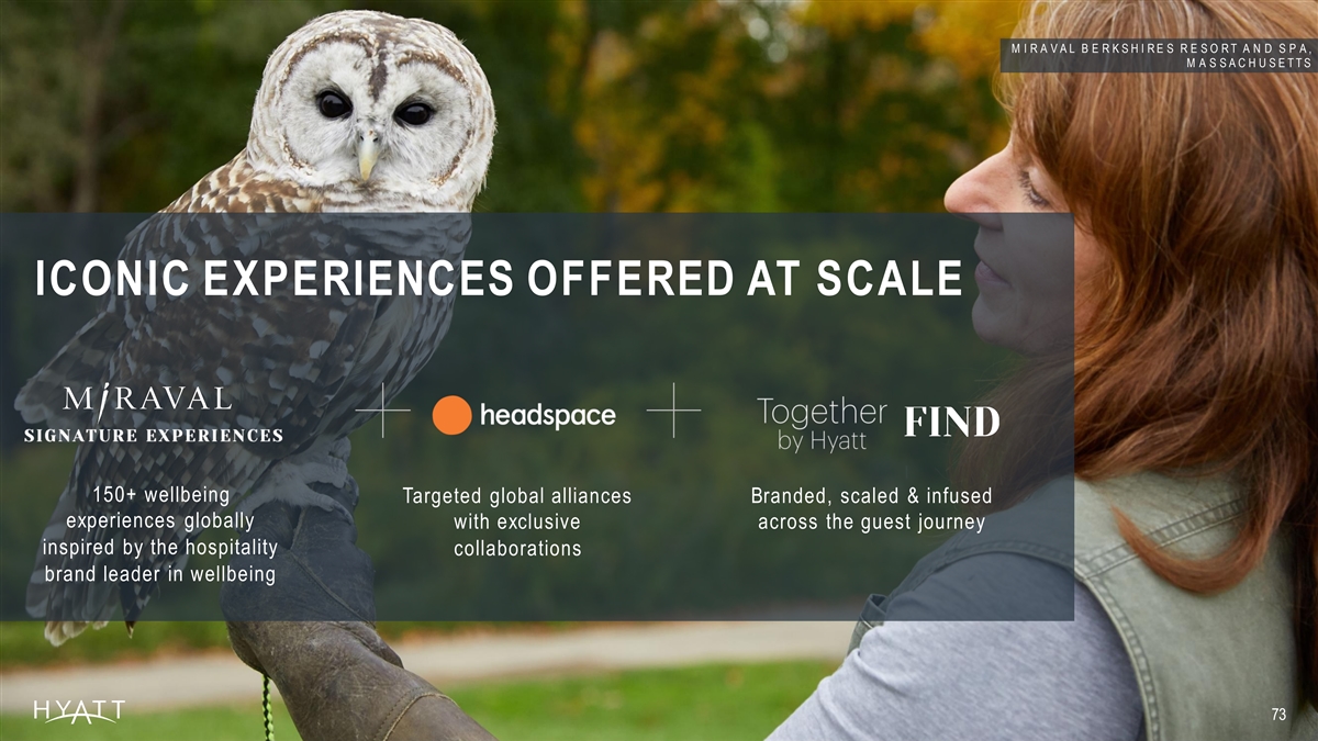 M I R A V A L B E R K S H I R E S R E S O R T A N D S P A , M A S S A C H U S E T T S ICONIC EXPERIENCES OFFERED AT SCALE 150+ wellbeing Targeted global alliances Branded, scaled & infused experiences globally with exclusive across the guest journey inspired by the hospitality collaborations brand leader in wellbeing 73