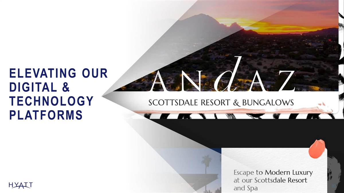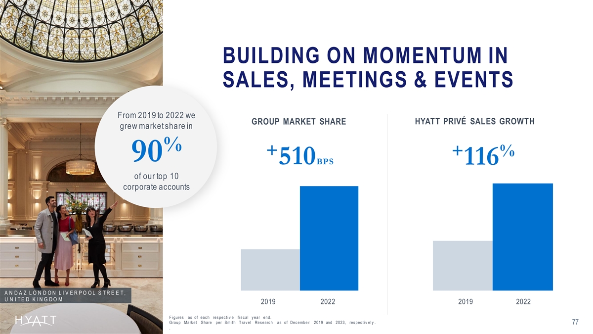 BUILDING ON MOMENTUM IN SALES, MEETINGS & EVENTS From 2019 to 2022 we HYATT PRIVÉ SALES GROWTH GROUP MARKET SHARE grew market share in % + + % 90 510BPS 116 of our top 10 corporate accounts A N D A Z L O N D O N L I V E R P O O L S T R E E T , U N I T E D K I N G D O M 2019 2022 2019 2022 F i gures as of eac h res pec ti v e fi s c al y ear end. G roup Mark et S hare per S mi th T rav el Res earc h as of Dec embe r 2019 and 2023, res pec ti v el y . 77 .