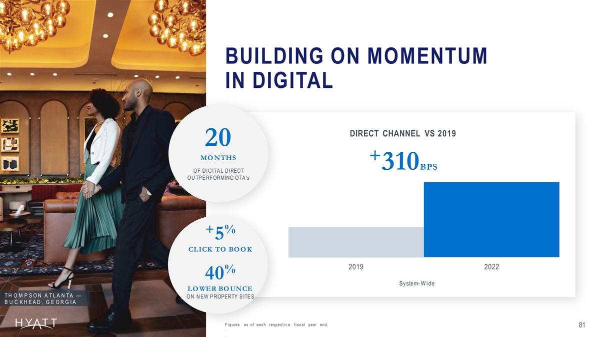 BUILDING ON MOMENTUM IN DIGITAL DIRECT CHANNEL VS 2019 20 MO NTHS + 310BPS OF DIGITA L DIRECT OU TPE RFORMING OTA’s + % 5 CLICK TO BO O K 2019 2022 % 40 Sy stem- W i de LO WER BO UNCE T H O M P S O N A T L A N T A — ON N EW P ROPERTY S ITES B U C K H E A D , G E O R G I A F i gures as of eac h res pec ti v e fi s c al y ear end. 81 . .