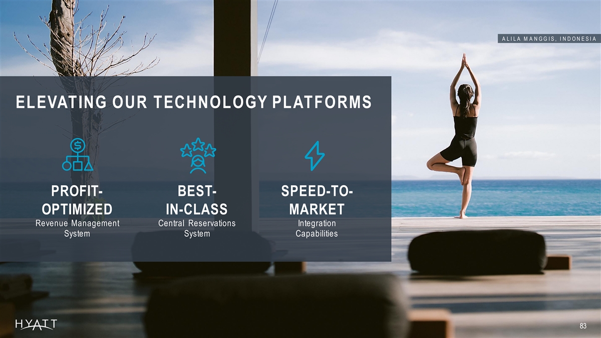 A L I L A M A N G G I S , I N D O N E S I A ELEVATING OUR TECHNOLOGY PLATFORMS PROFIT- BEST- SPEED-TO- OPTIMIZED IN-CLASS MARKET Revenue Management Central Reservations Integration System System Capabilities 83 83
