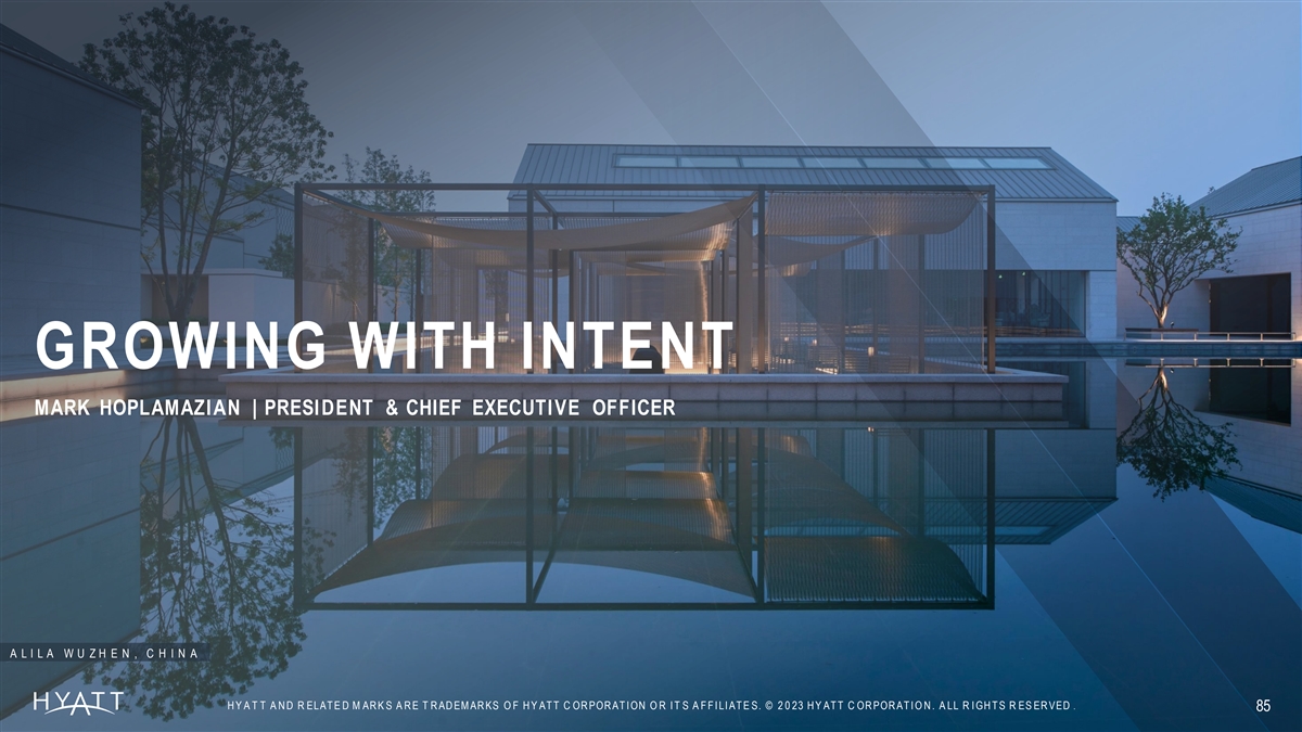 GROWING WITH INTENT MARK HOPLAMAZIAN | PRESIDENT & CHIEF EXECUTIVE OFFICER A L I L A W U Z H E N , C H I N A H Y A T T A N D R ELAT E D M AR K S A R E T R AD EM AR KS O F H Y AT T C OR POR AT I ON O R I T S A F F I LI AT E S. © 2 0 23 H Y AT T C OR POR AT I O N . A LL R I GH T S R ES ER VED . 85