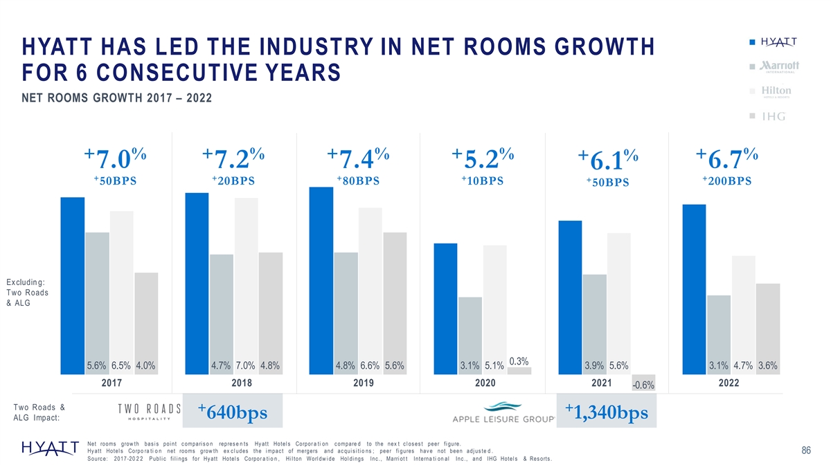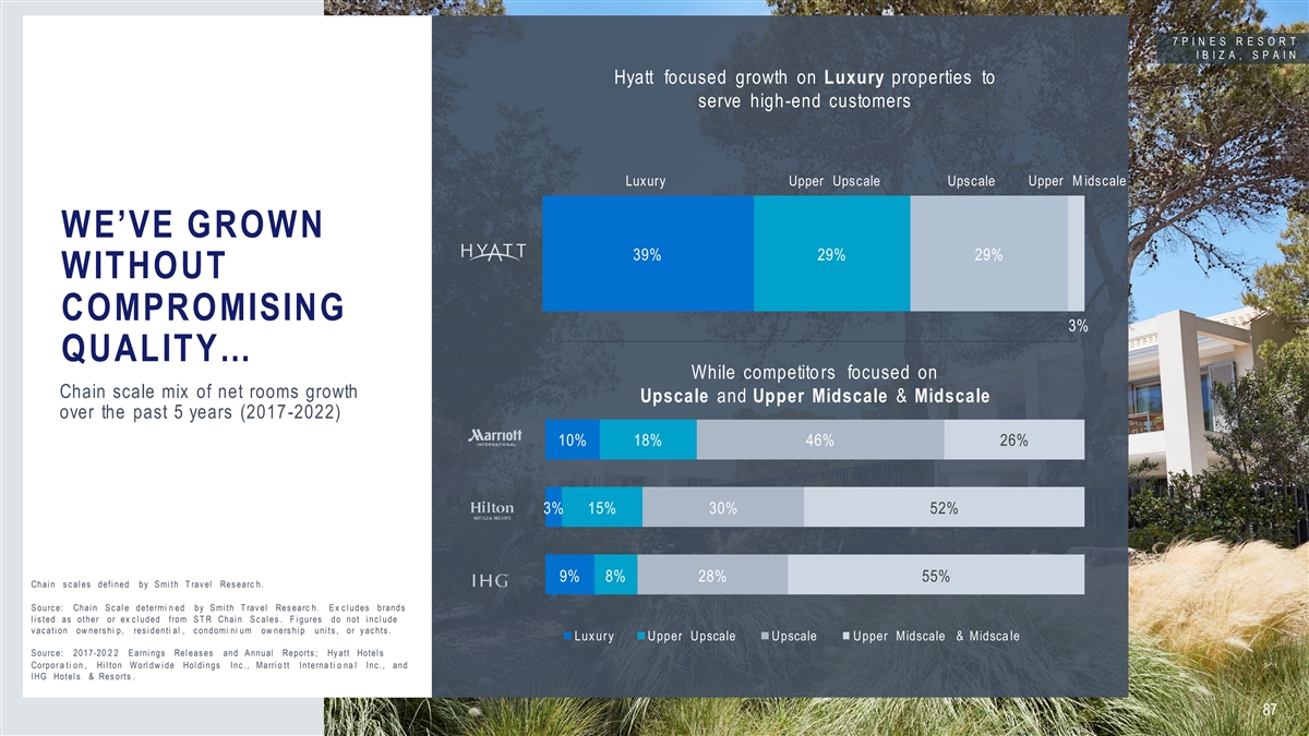 HYATT HAS LED THE INDUSTRY IN NET ROOMS GROWTH FOR 6 CONSECUTIVE YEARS Hyatt NET ROOMS GROWTH 2017 – 2022 Marriott Hilton IHG + % + % + % + % + % + % 7.0 7.2 7.4 5.2 6.7 6.1 + + + + + + 50BPS 20BPS 80BPS 10BPS 200BPS 50BPS Ex cludin g: Two Roads & ALG 0.3% 5.6% 6.5% 4.0% 4.7% 7.0% 4.8% 4.8% 6.6% 5.6% 3.1% 5.1% 3.9% 5.6% 3.1% 4.7% 3.6% 2017 2018 2019 2020 2021 2022 -0.6% Two Roads & + + 640bps 1,340bps ALG Impact: Net rooms grow th bas i s poi nt c ompari s o n repres e n ts Hy att Hotel s Corpor a ti on c ompare d to the nex t c l os es t peer fi gure. Hy att Hotel s Corpo ra ti o n net rooms grow th ex c l udes the i mpac t of mergers and ac qui s i ti o ns ; peer fi gures hav e not been adj us te d. 86 S ourc e: 2017 -20 2 2 P ubl i c fi l i ngs for Hy att Hotel s Corpor a ti o n , Hi l ton Worl dw i de Hol di ngs Inc ., Marri ot t Interna ti on al Inc ., and IHG Hotel s & Res orts .