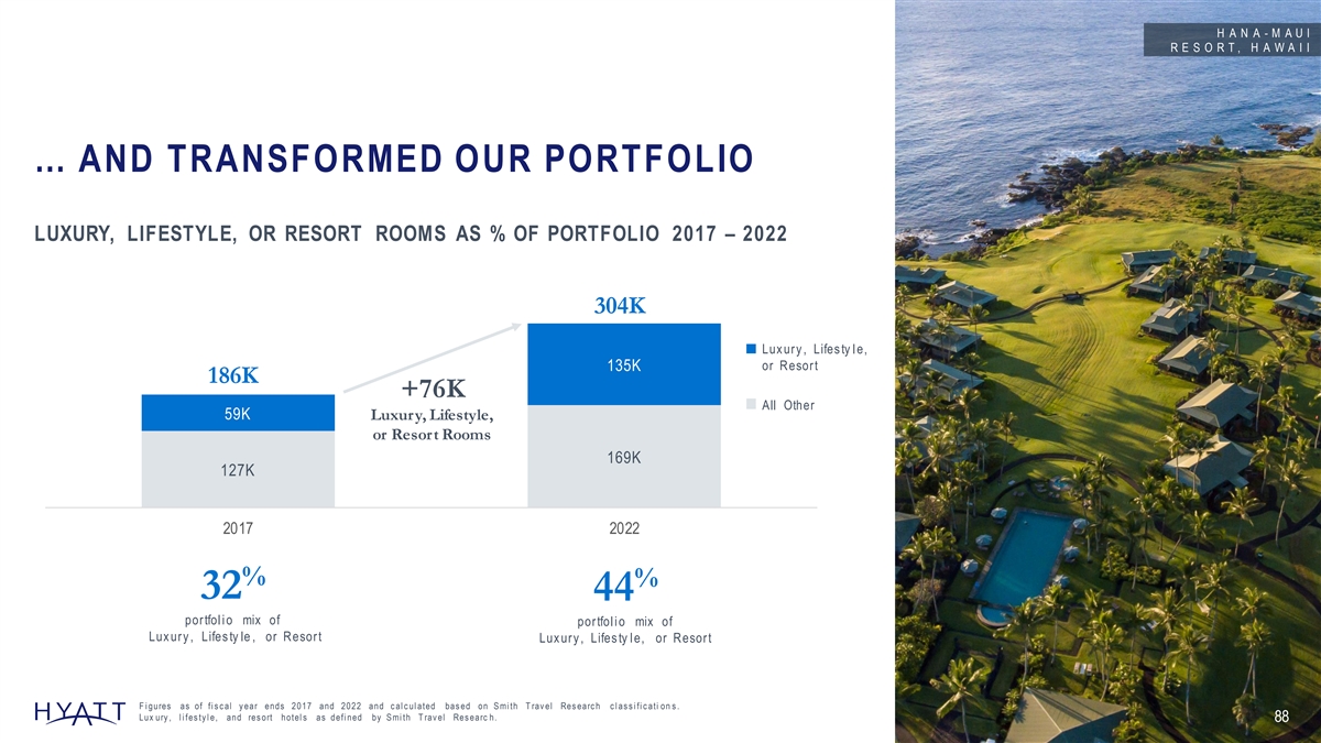 H A N A - M A U I R E S O R T , H A W A I I … AND TRANSFORMED OUR PORTFOLIO LUXURY, LIFESTYLE, OR RESORT ROOMS AS % OF PORTFOLIO 2017 – 2022 304K Lux ury , Lifes ty l e, or Resort 135K 186K +76K All Other 59K Luxury, Lifestyle, or Resort Rooms 169K 127K 2017 2022 % % 32 44 portfol i o mix of portfol i o mix of Lux ury , Lifes ty le , or Resort Lux ury , Lifes ty l e, or Resort F i gures as of fi s c al y ear ends 2017 and 2022 and c al c ul ated bas ed on S mi th T rav el Res earc h c l as s i fi c ati on s . Lux ury , l i fes ty l e, and res ort hotel s as defi ned by S mi th T rav el Res earc h. 88