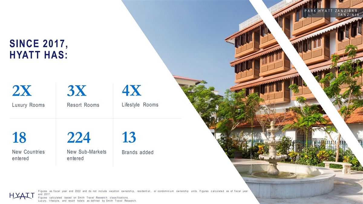 P A R K H Y A T T Z A N Z I B A R , T A N Z I N I A SINCE 2017, HYATT HAS: 4X 2X 3X Lifestyle Rooms Luxury Rooms Resort Rooms 13 18 224 New Countries New Sub-Markets Brands added entered entered F i gures as fi s c al y ear end 2022 and do not i nc l ude v ac ati on ow ners hi p, res i denti al , or c ondomi ni u m ow ners hi p uni ts . F i gures c al c ul ate d as of fi s c al y ear end 2017. 89 F i gures c al c ul ated bas ed on S mi th T rav el Res earc h c l as s i fi c ati o ns . Lux ury , l i fes ty l e, and res ort hotel s as defi ned by S mi th T rav el Res earc h.