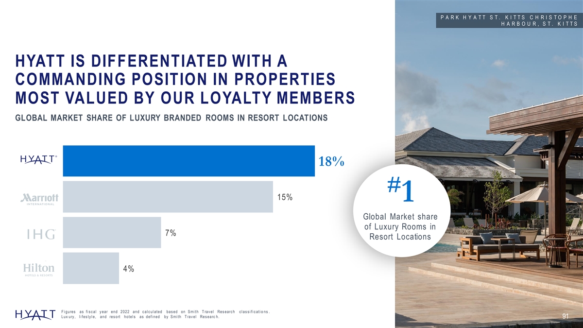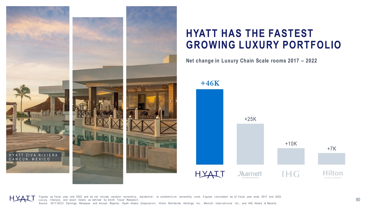 HYATT HAS THE FASTEST GROWING LUXURY PORTFOLIO Net change in Luxury Chain Scale rooms 2017 – 2022 +46K +25K +10K +7K H Y A T T Z I V A R I V I E R A C A N C U N , M E X I C O F i gures as fi s c al y ear end 2022 and do not i nc l ude v ac ati on ow ners hi p, res i denti al , or c ondomi ni u m ow ners hi p uni ts . F i gures c al c ul ate d as of fi s c al y ear ends 2017 and 2022. Lux ury , l i fes ty l e, and res ort hotel s as defi ned by S mi th T rav el Res earc h. 90 S ourc e: 2017 -20 2 2 E arni ngs Rel eas es and A nnual Reports ; Hy att Hotel s Corpo ra ti o n, Hi l ton Worl dw i de Hol di ngs Inc ., Marri ot t Inter n ati o n al Inc ., and IHG Hotel s & Res orts .